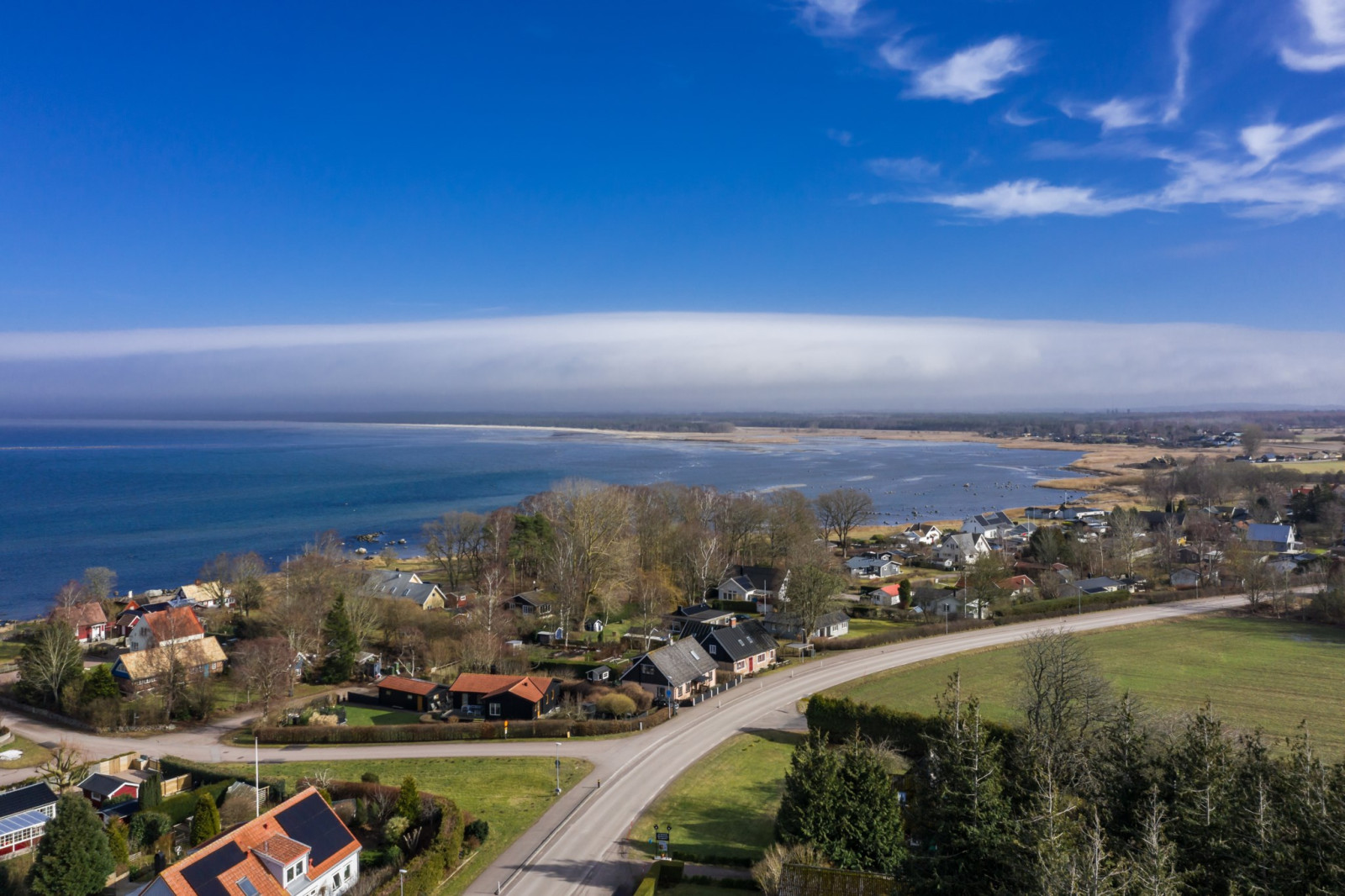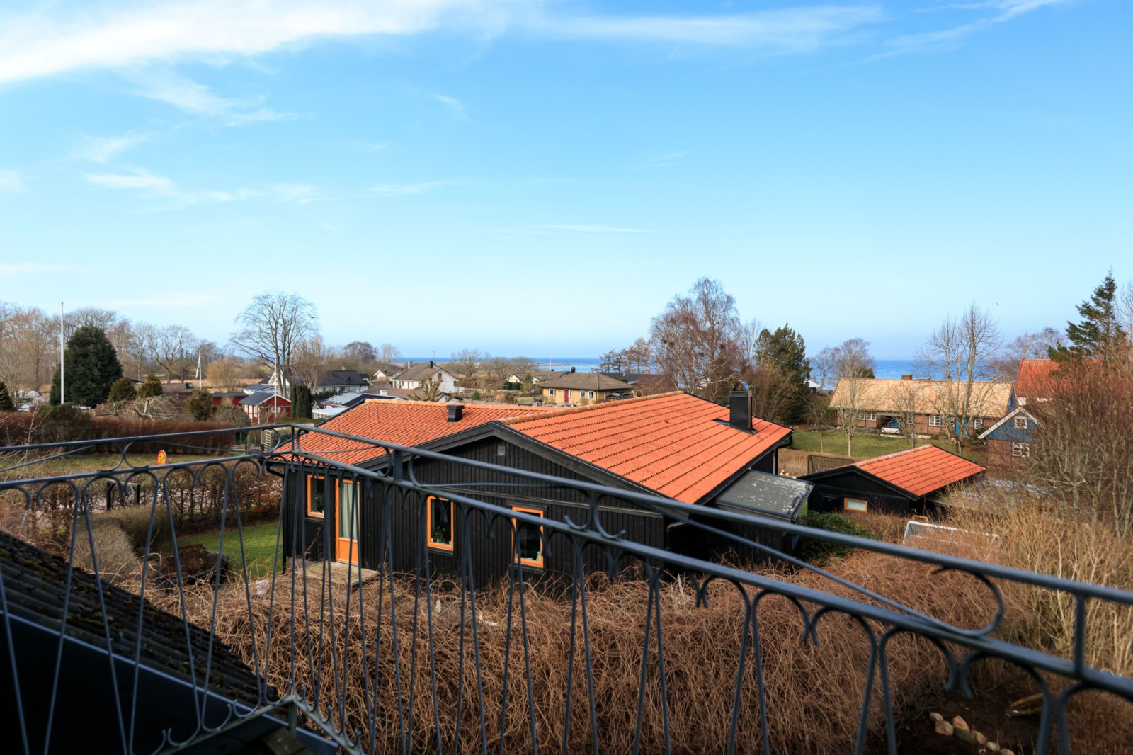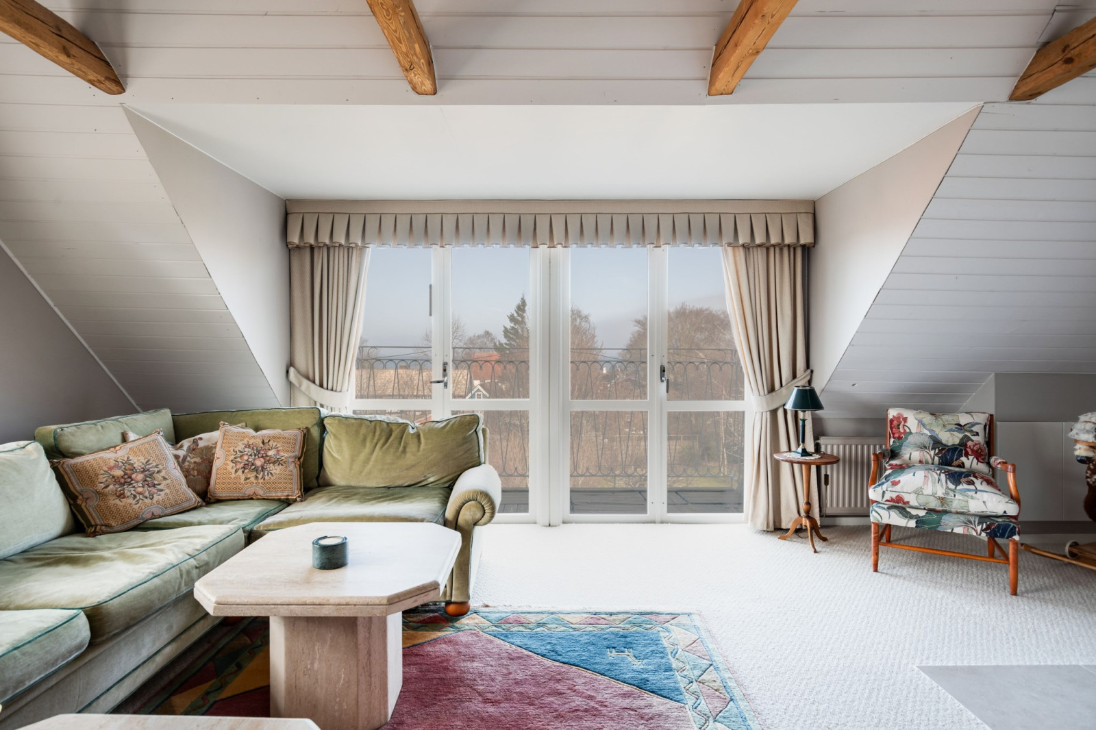 Generöst och inbjudande allrum med snedtak och synliga träbjälkar som ger rummet karaktär. Ljusa väggar och textilt golv skapar en varm och ombonad känsla. Stort fönsterparti ut mot balkongen ger fint ljusinsläpp och härlig utsikt. Centralt placerad vitputsad öppen spis bidrar till en trivsam atmosfär.
