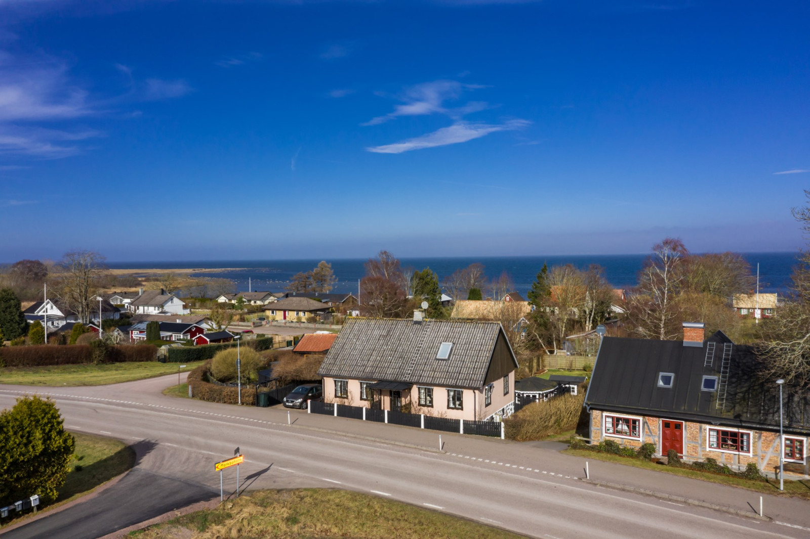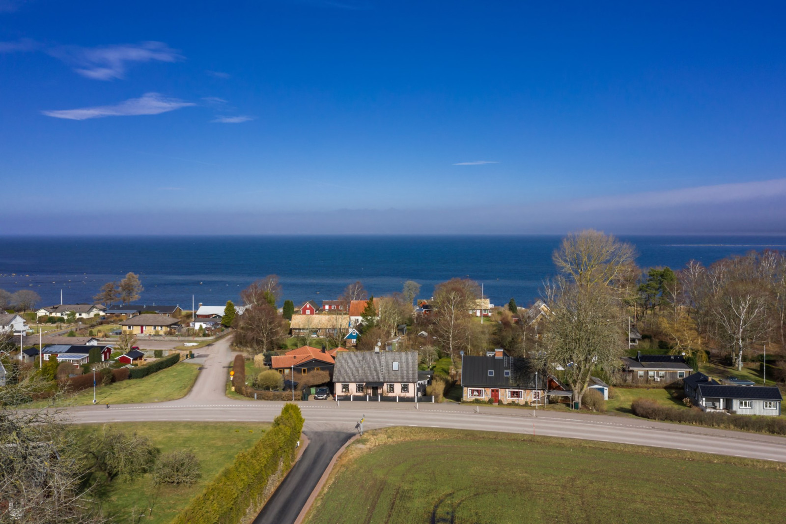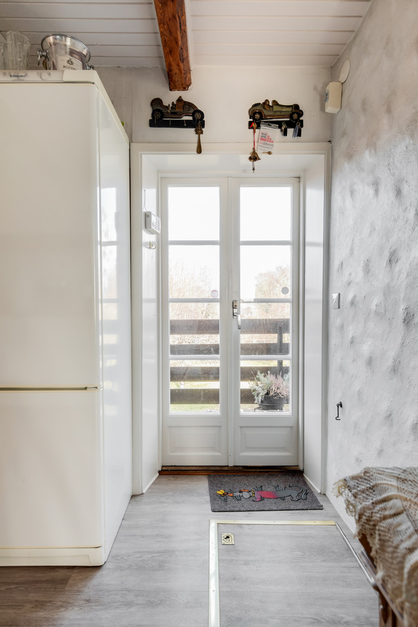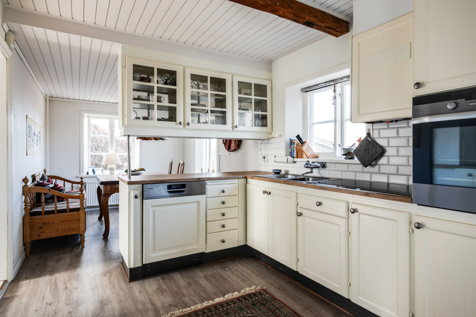 Själva köksdelen är centralt placerad och generös i sin storlek och har utgång mot baksidan, vilket ger en smidig koppling mellan kök, trädgård och uteplats. Synliga takbjälkar och en vitputsad stenvägg bidrar till atmosfären och ger rummet en genuin karaktär. Köket renoverades senast 2019-2020. Köksinredningen har ljusa målade luckor och gott om plats i skåp och lådor med bra arbetsytor.
