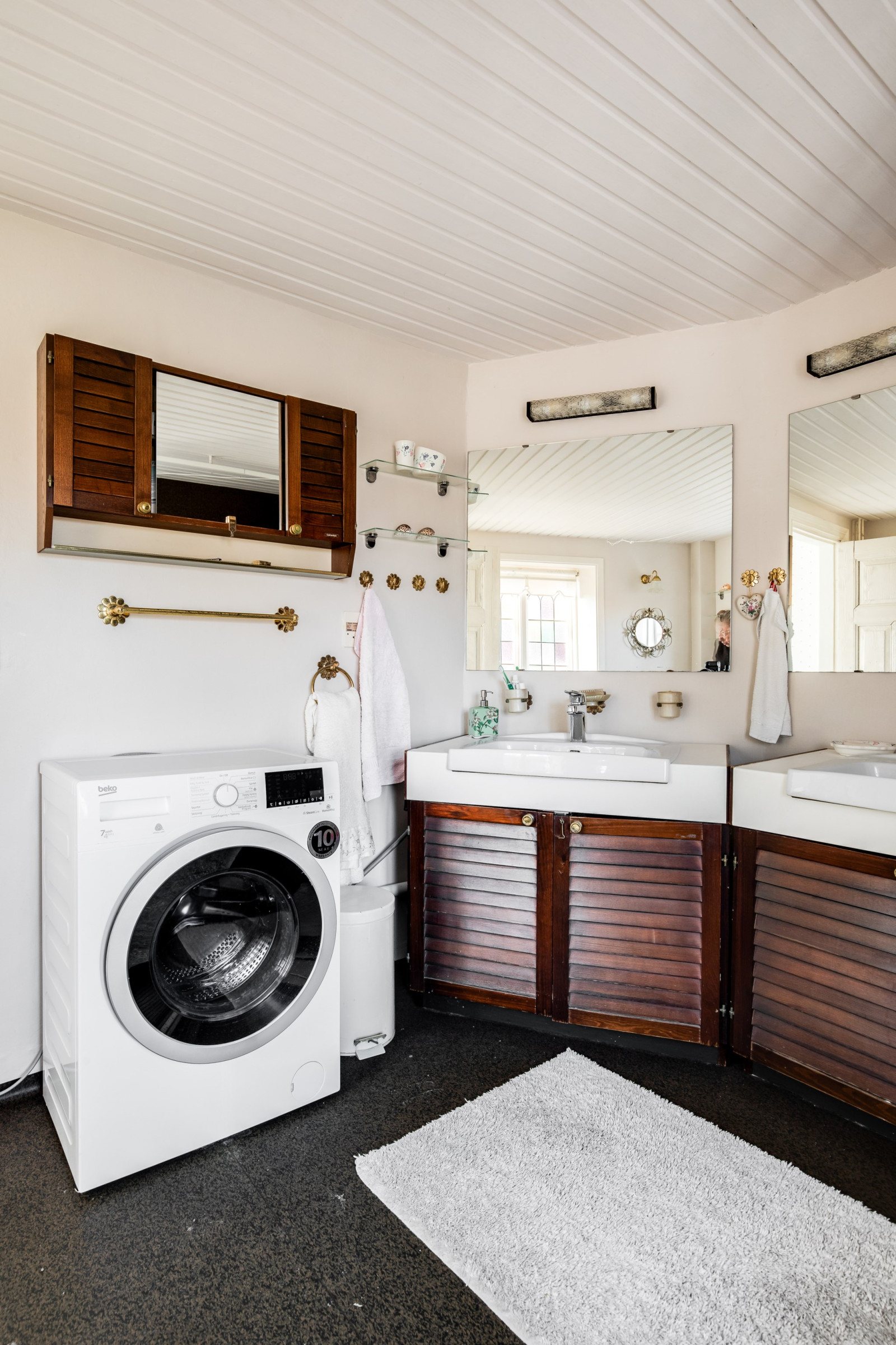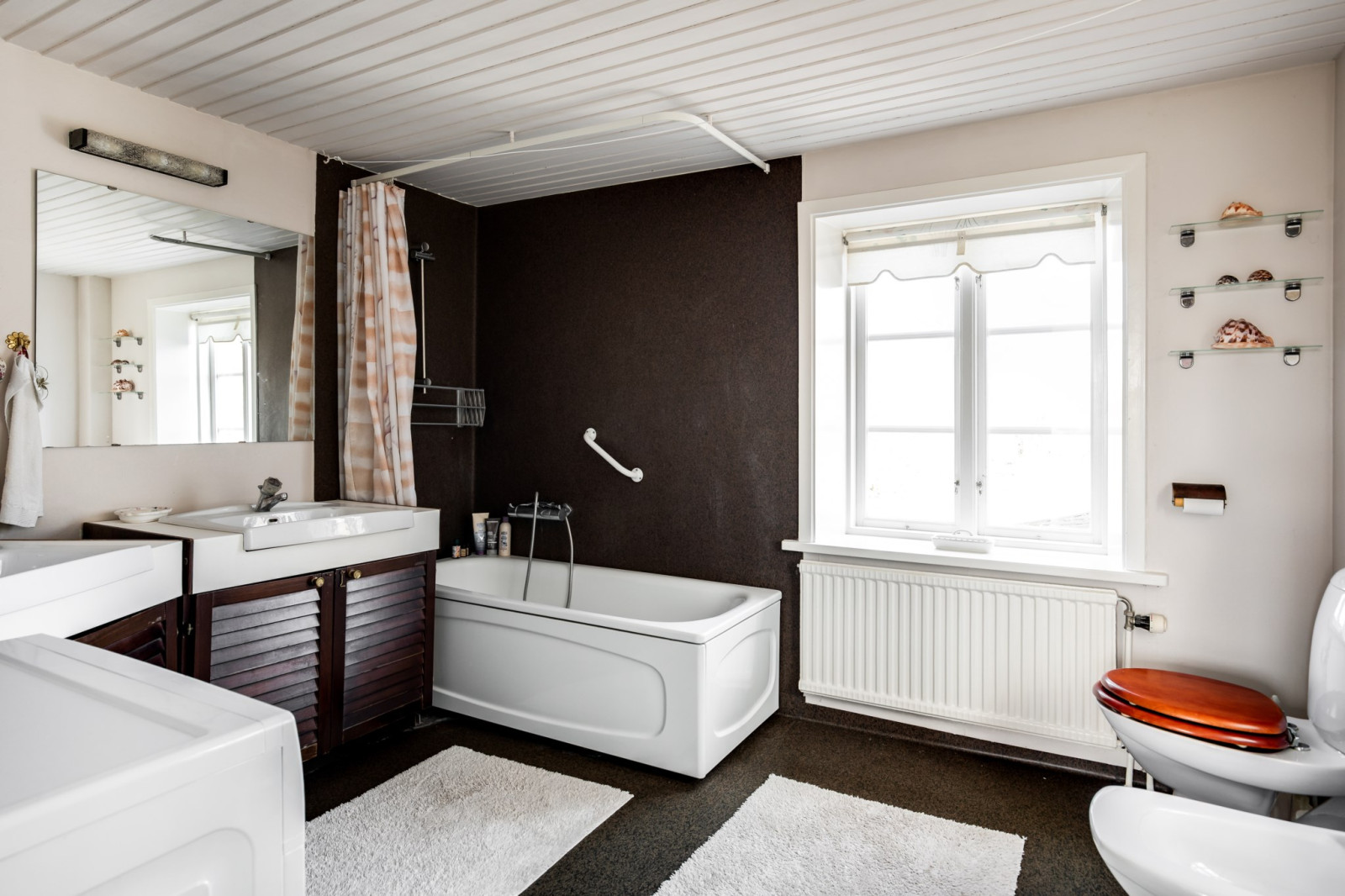 Badrum på entréplan, tidigare sovrum. Praktiskt och funktionellt för vardag och gäster.
