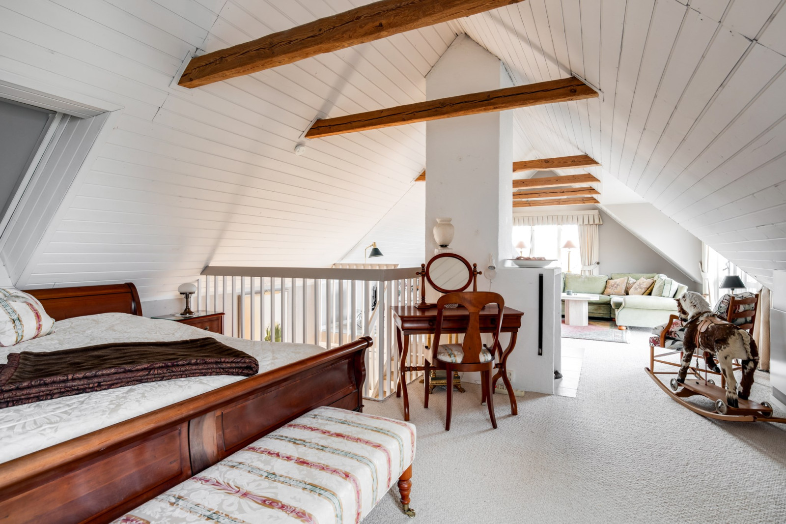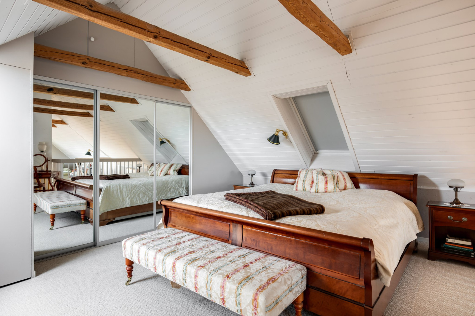 Öppet loft med plats för säng och mindre möblering. Vit panel i taket med synliga bjälkar förtstärker den charmiga och luftiga känslan. Skjutdörrsgarderob för effektiv förvaring.