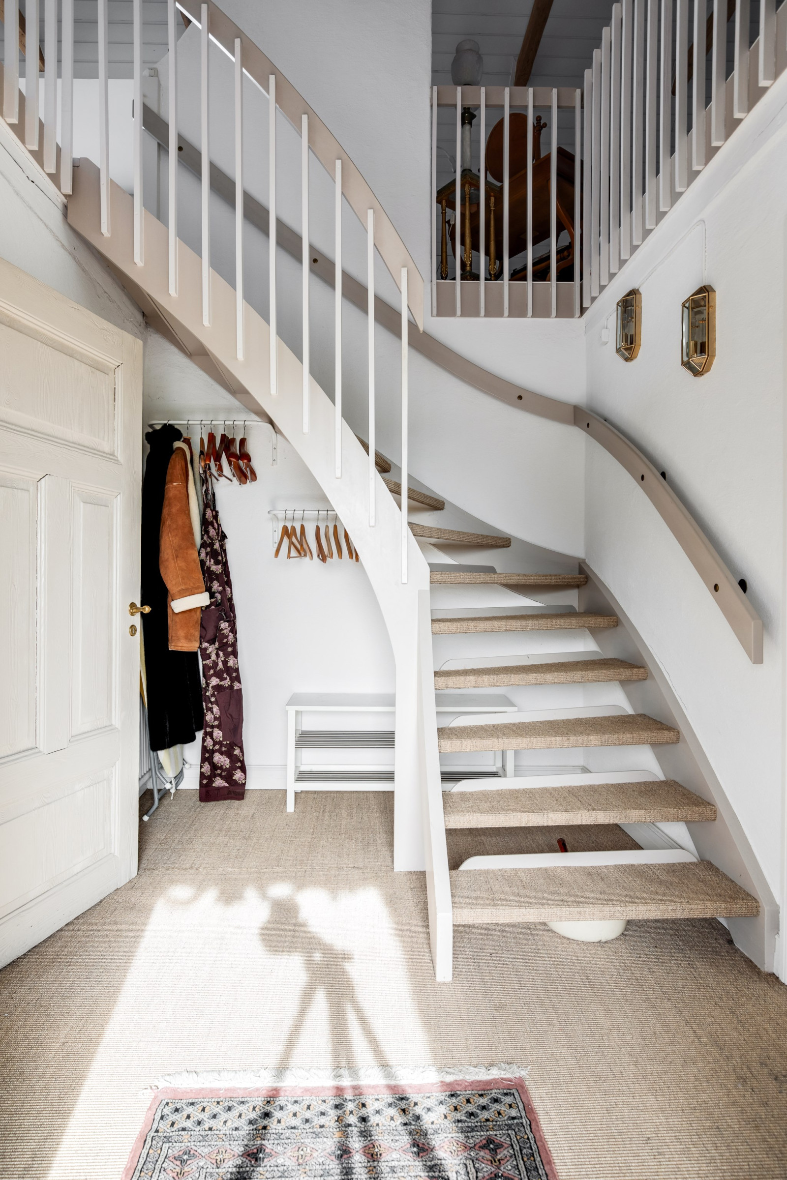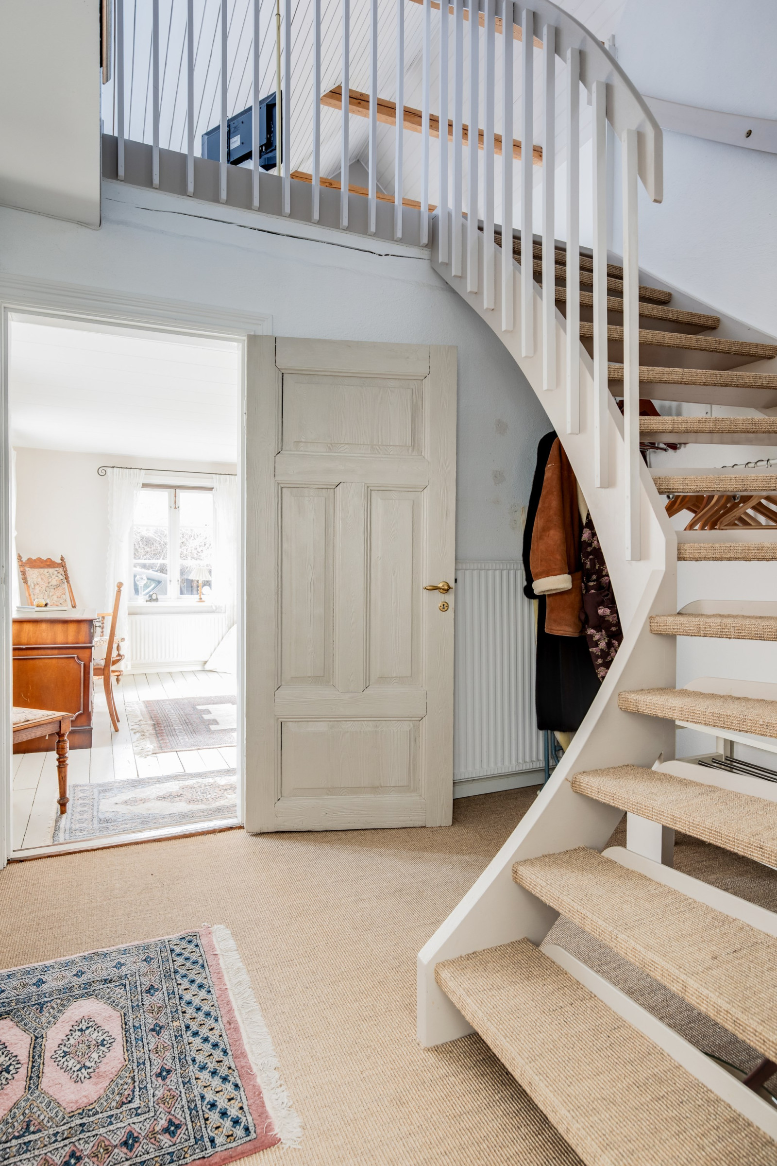 Välkomnande entré med plats för avhängning. Ger direkt kontakt med husets sociala ytor och trappan upp till övervåningen. Ljuset och husets charm märks direkt. Vacker trappa leder upp till husets öppna övre plan. Den öppna lösningen med vitmålat räcke bidrar till ett fint ljusflöde mellan våningarna.
