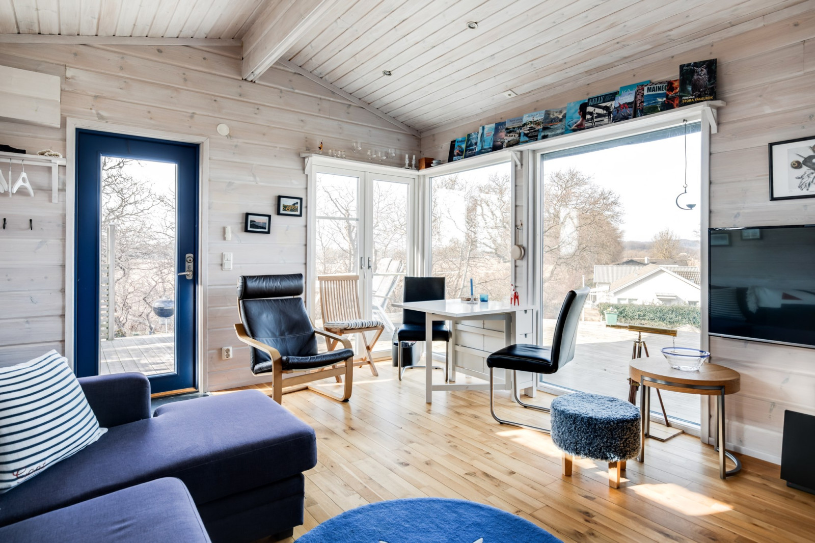 Invändigt är det byggt med fokus på livskvalitet. Du möts av ett charmigt sällskapsrum inrett upp i nock med en värmande braskamin. Härifrån kommer man vidare in i det helkaklade badrummet där det finns en vedeldad bastu med utsikt. Pentryköket är litet men rymmer det viktiga och här innanför finns husets sovrum.