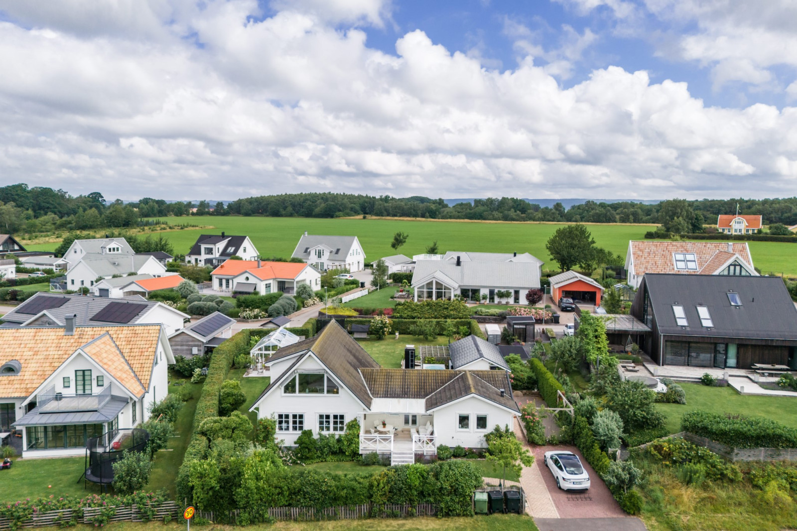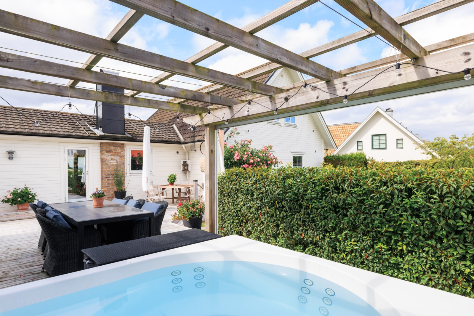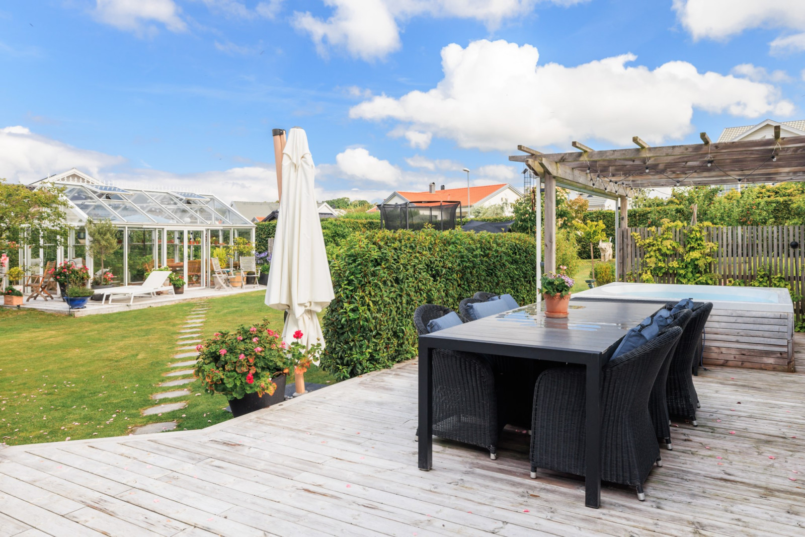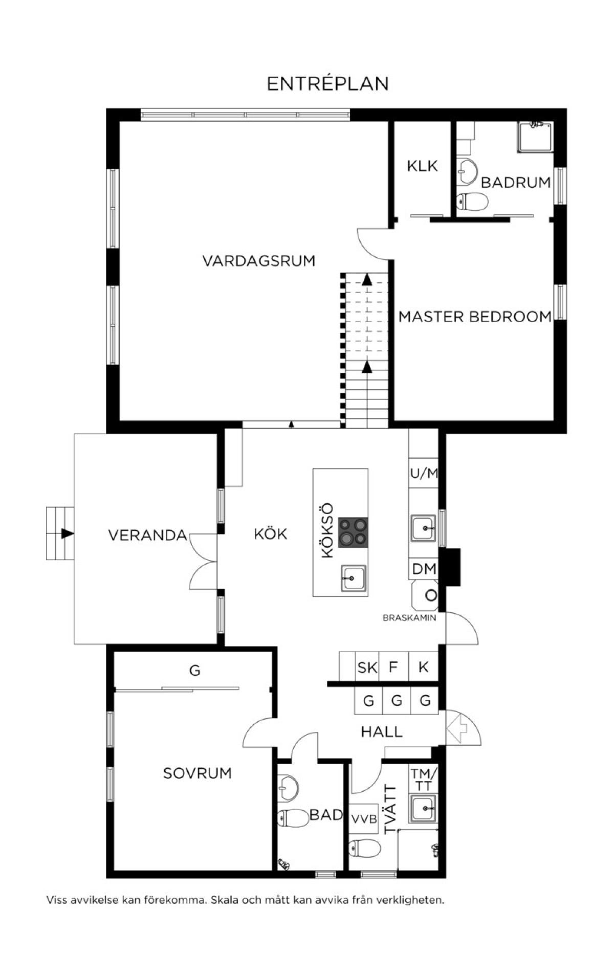 Stort och luftigt vardagsrum integrerat med köket bjuder på generöst ljusinsläpp och härliga sällskapsytor. Här finns gott om plats för både matsalsmöblemang och TV-del med soffgrupp.