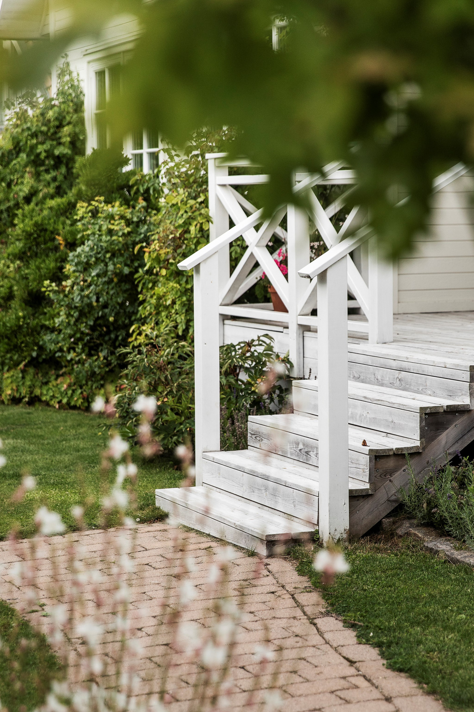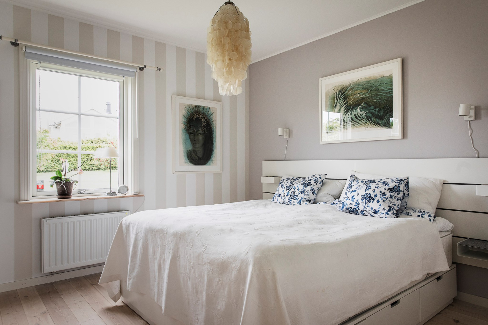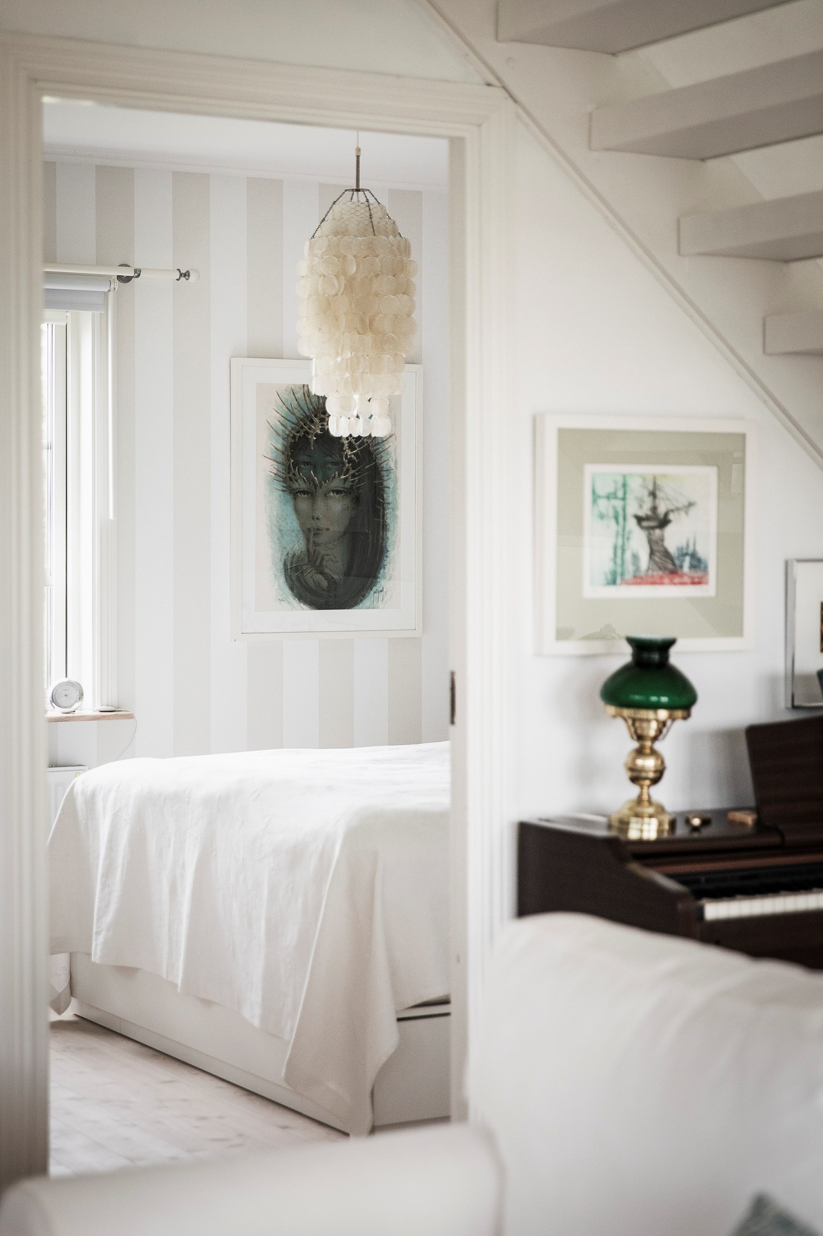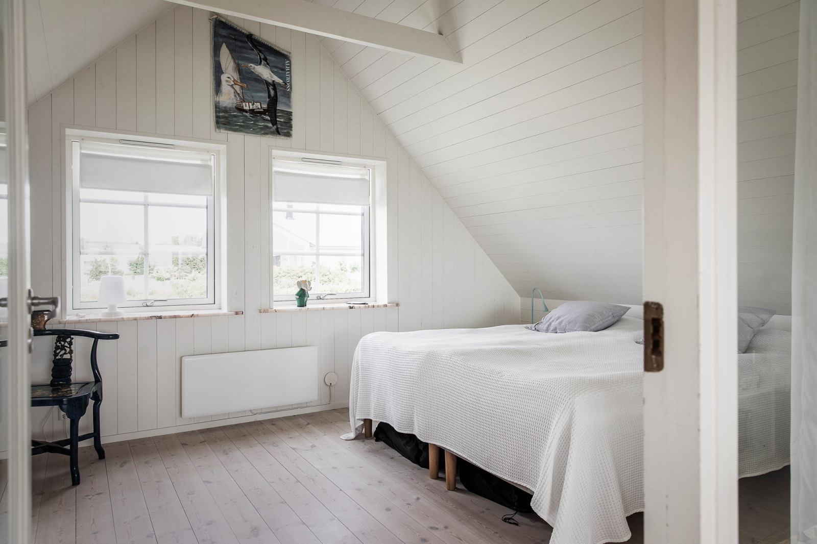 På övre plan finns även ett sovrum med utsikt mot trädgården.