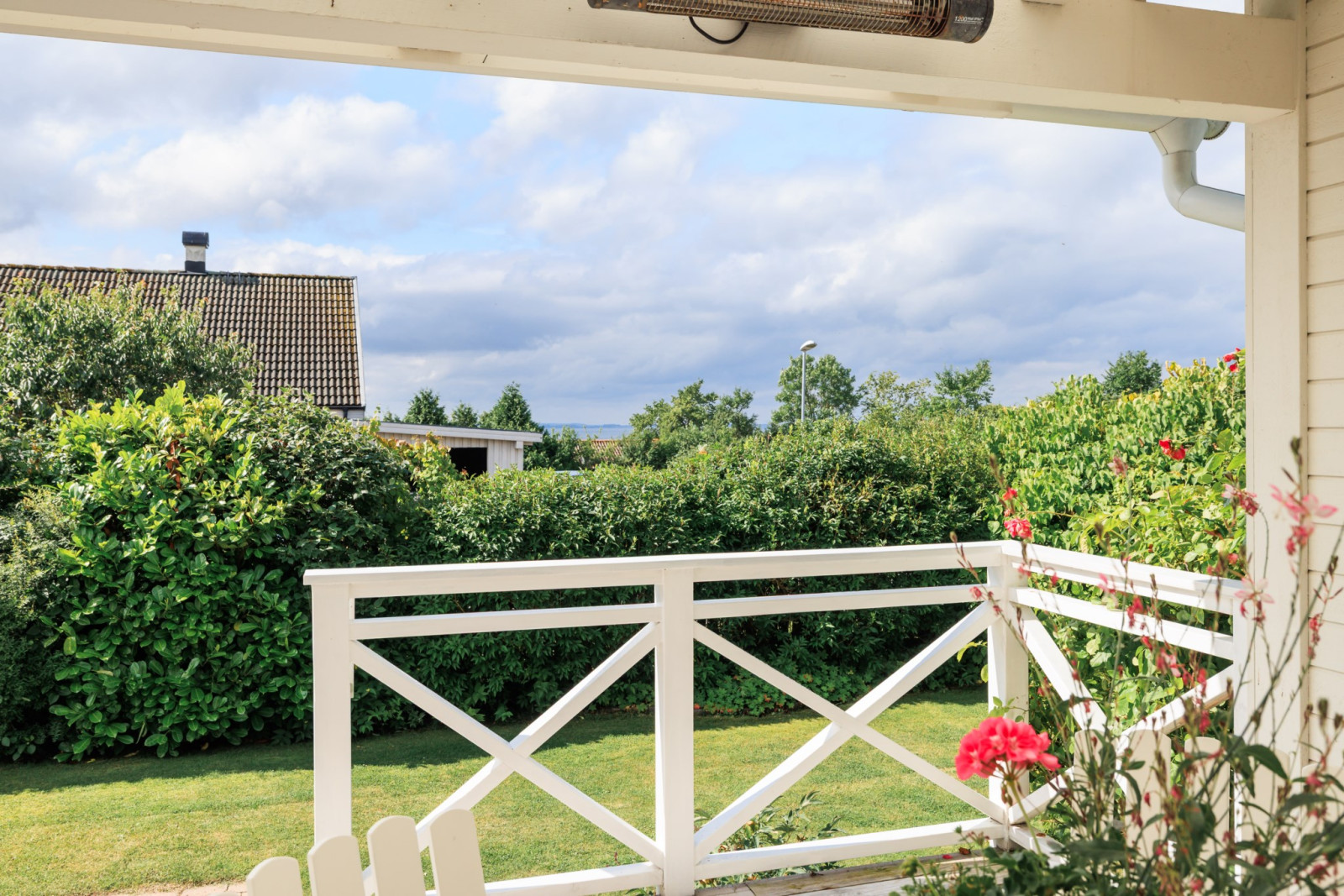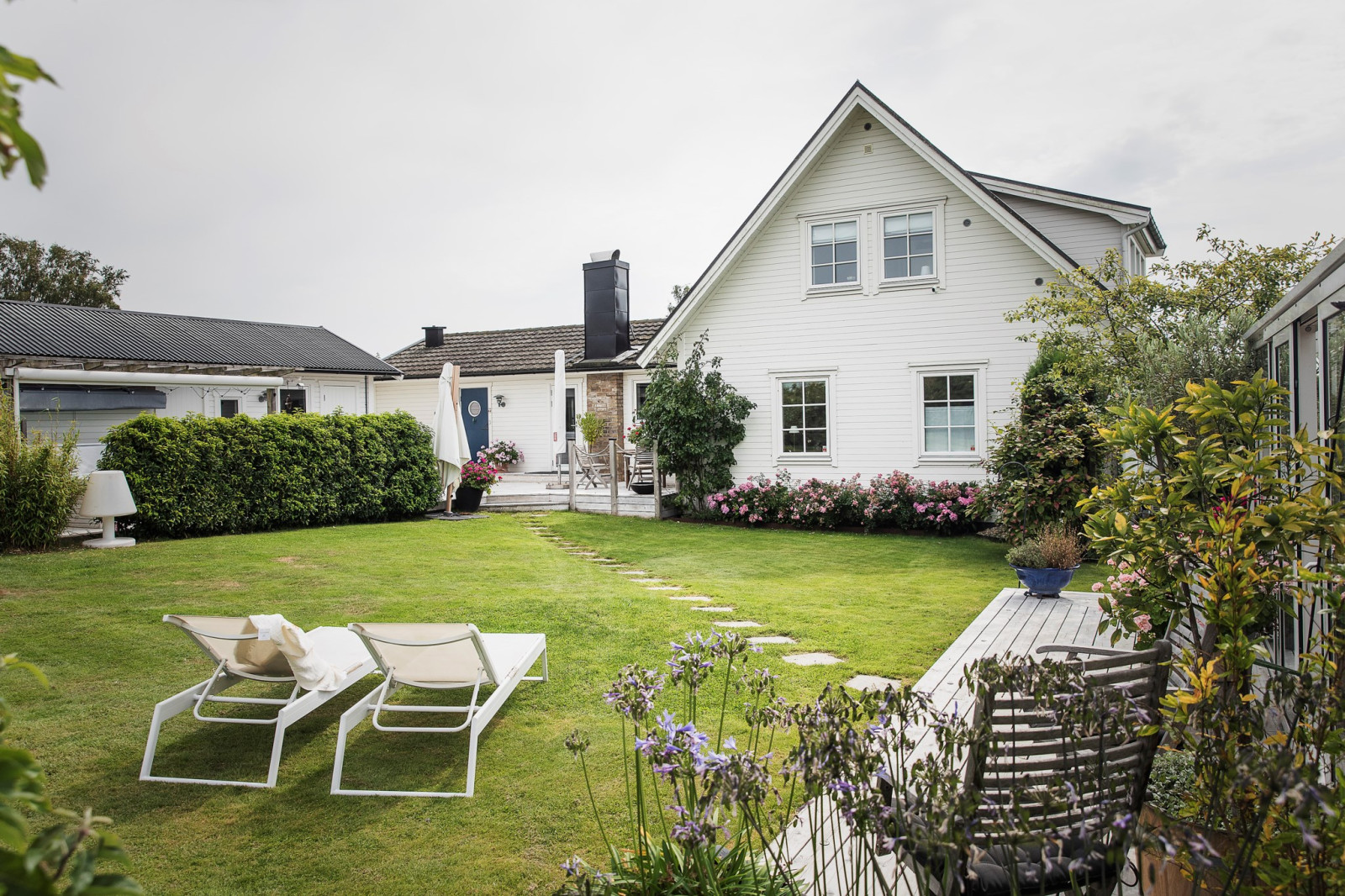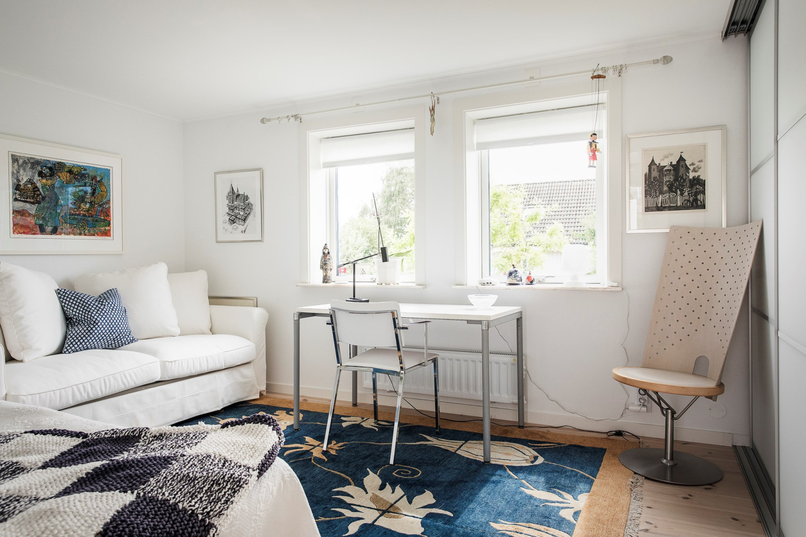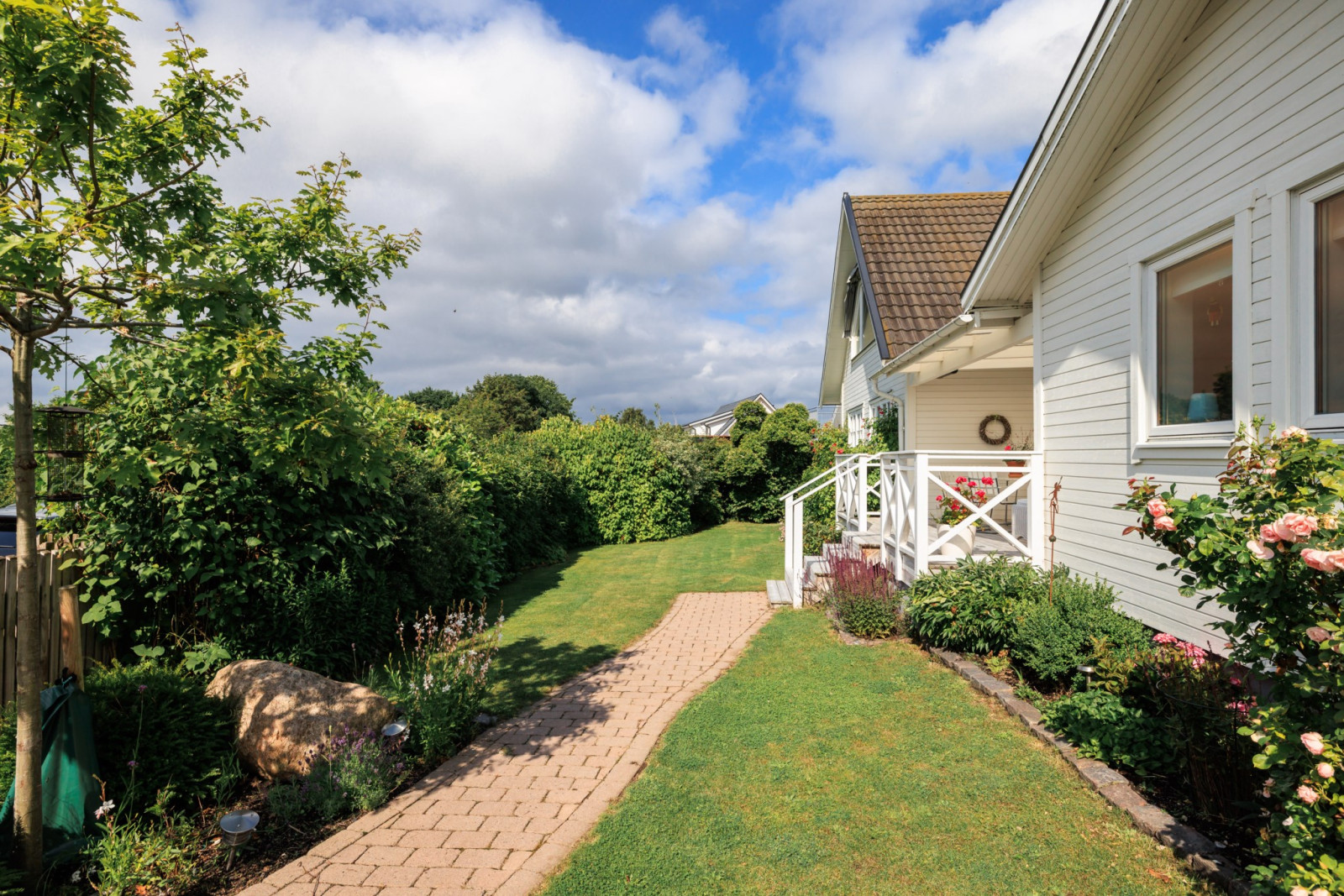 På övre plan finns även ett sovrum med utsikt mot trädgården.