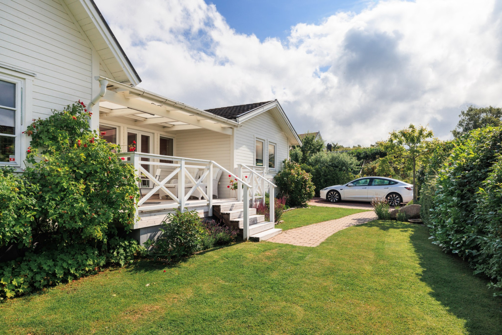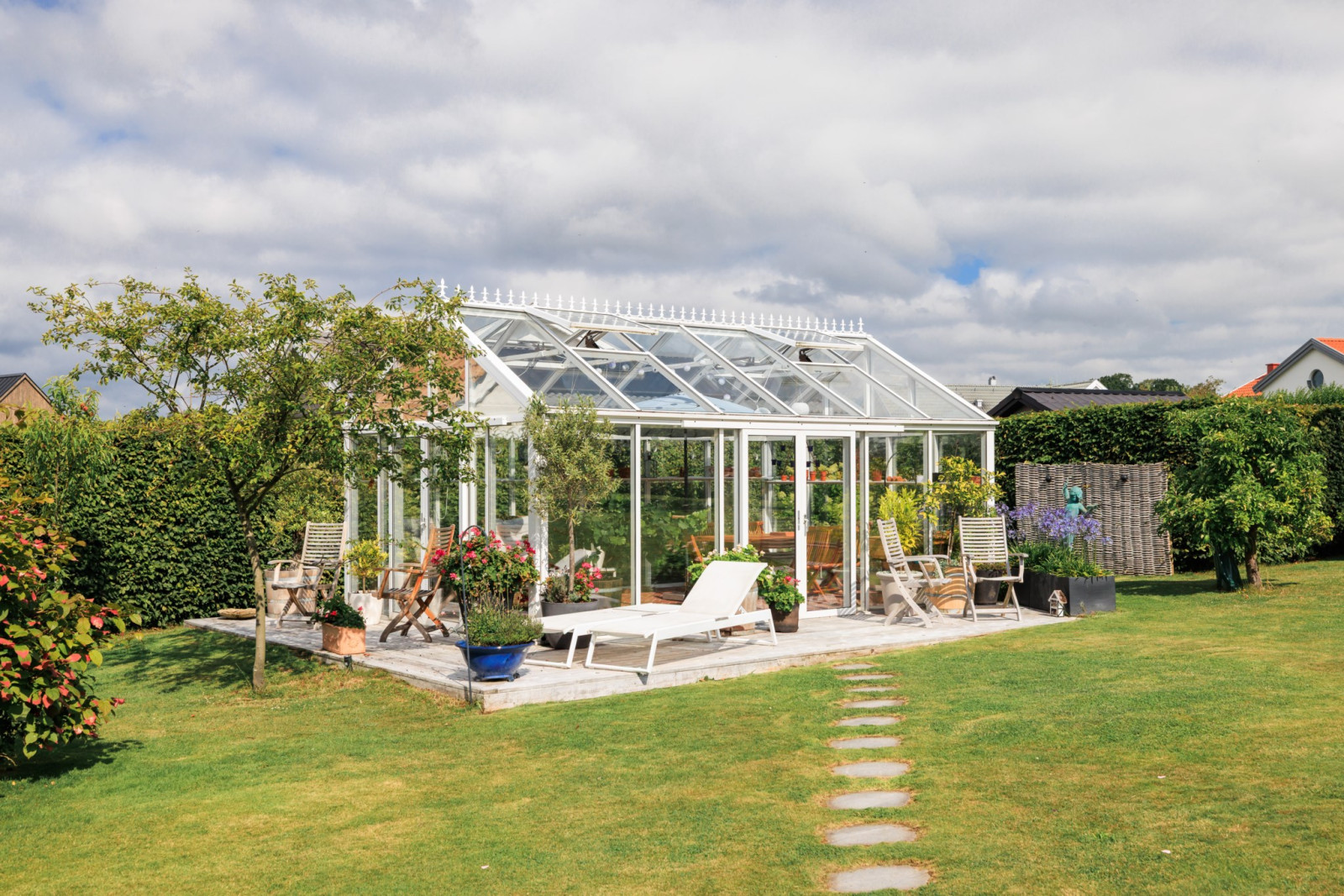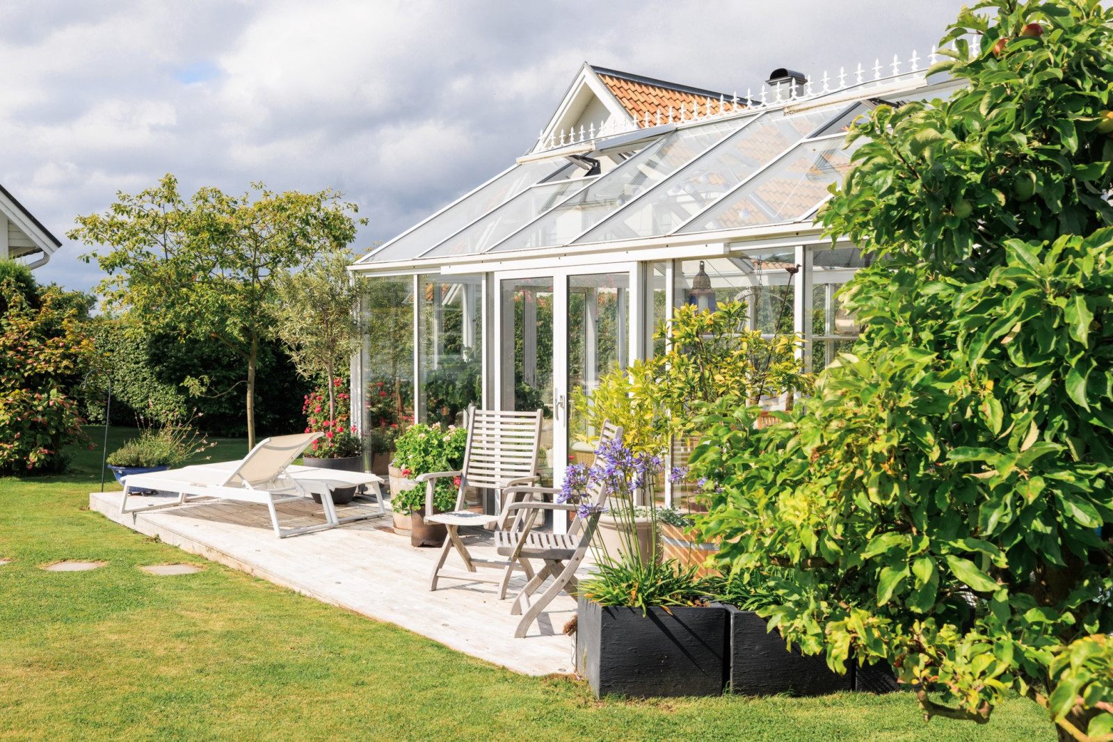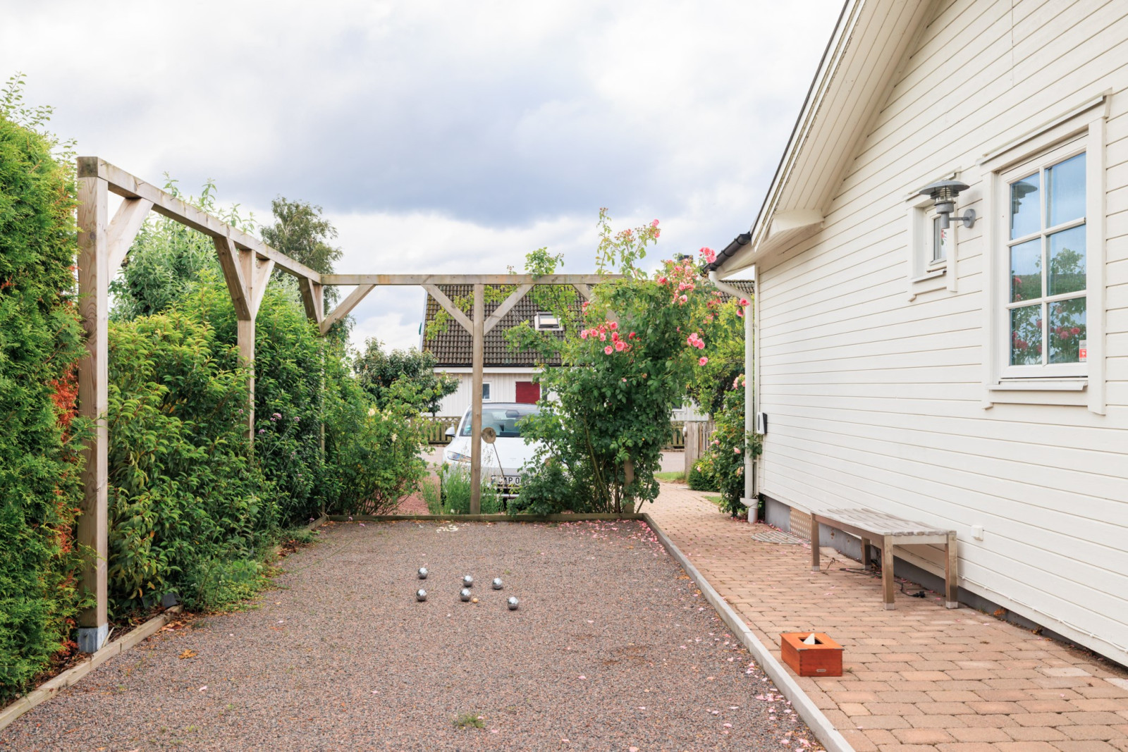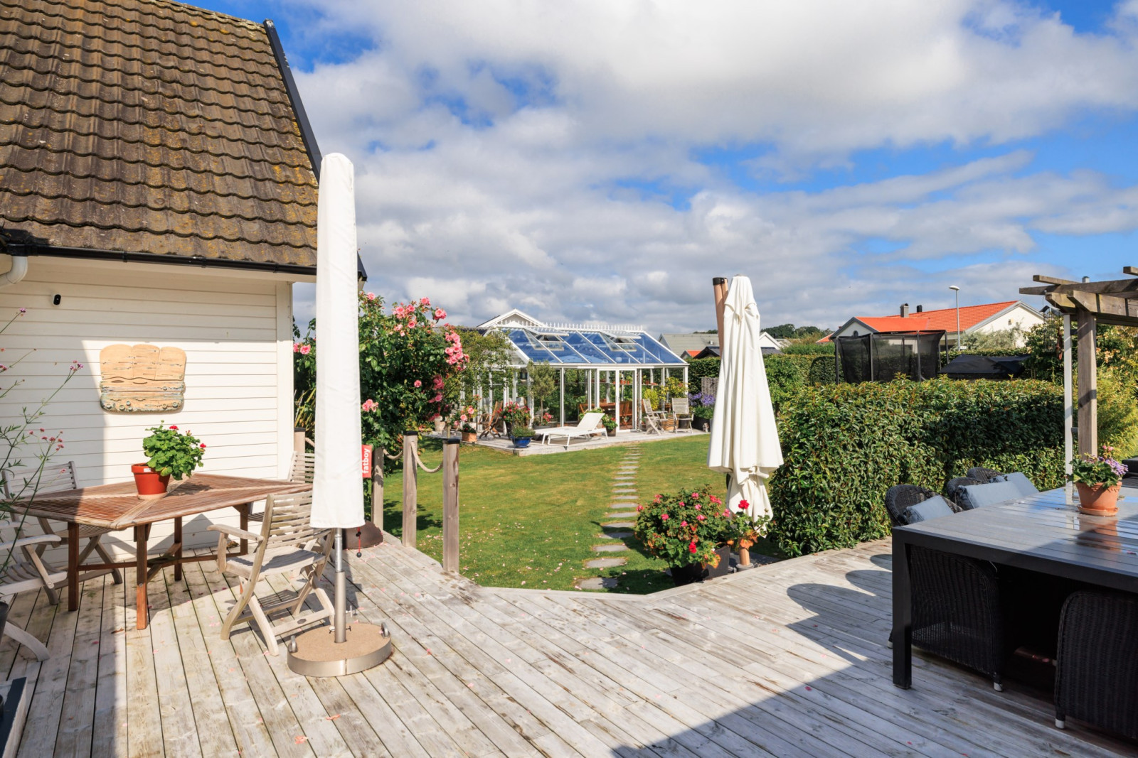 På övre plan finns även ett sovrum med utsikt mot trädgården.