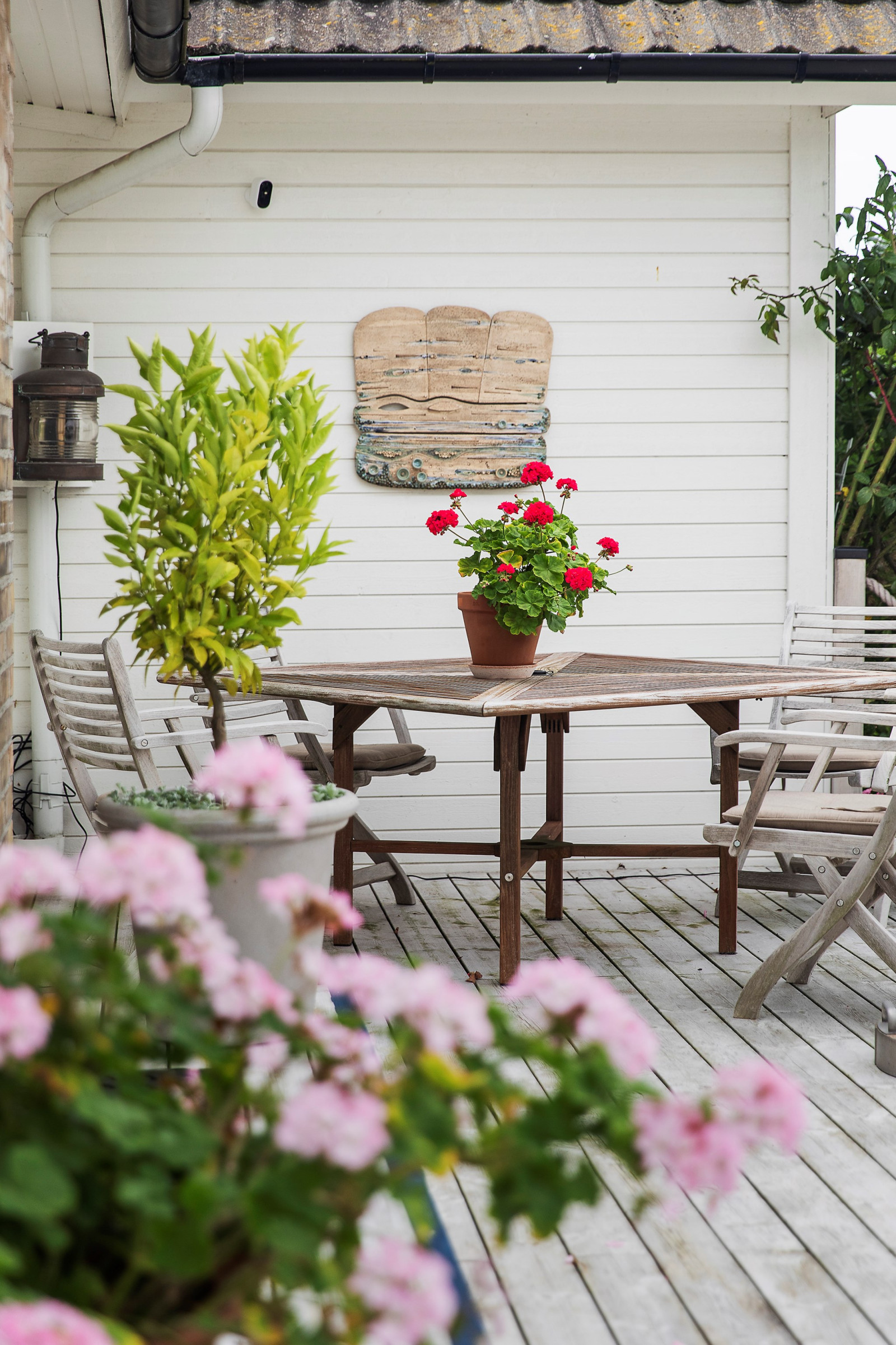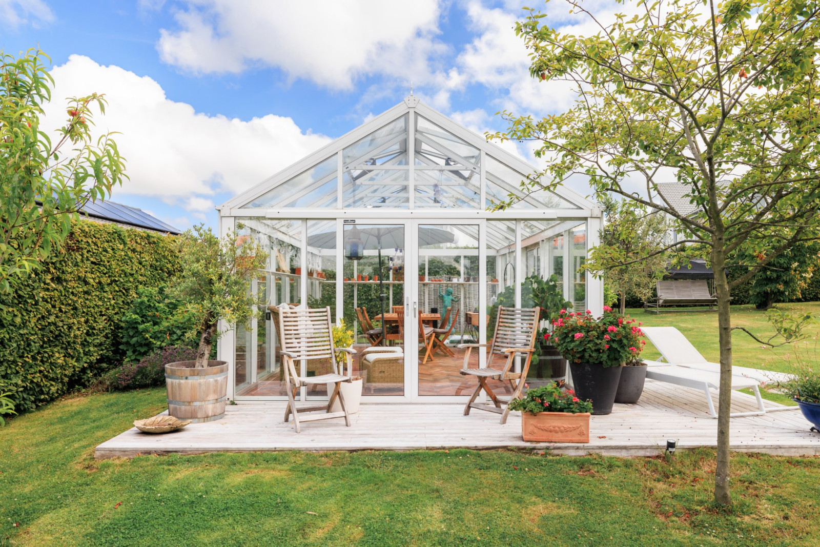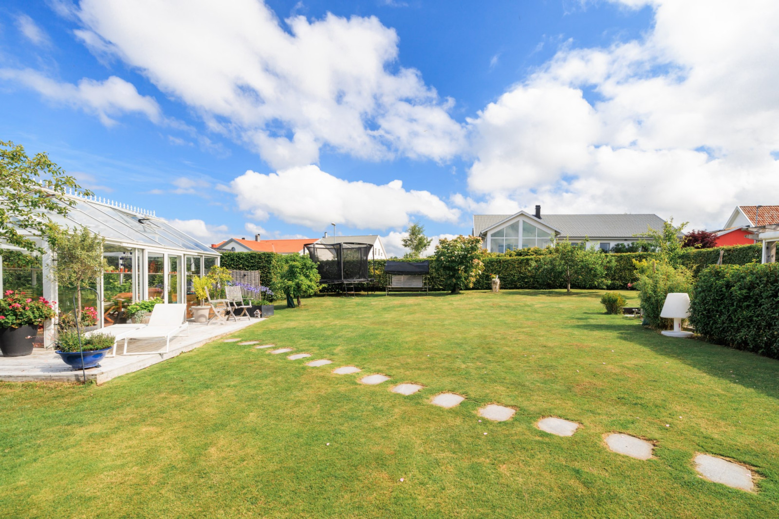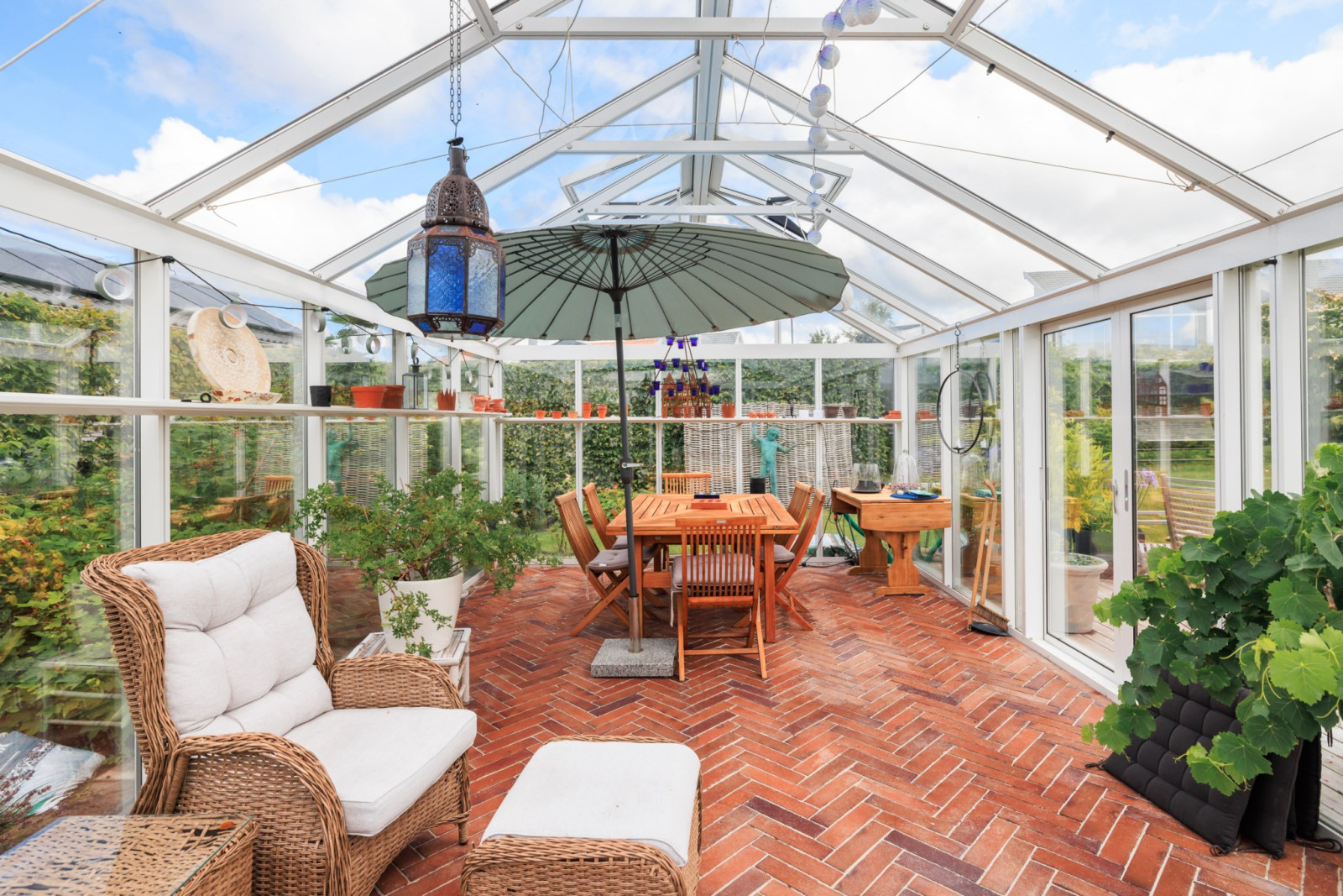 På övre plan finns även ett sovrum med utsikt mot trädgården.