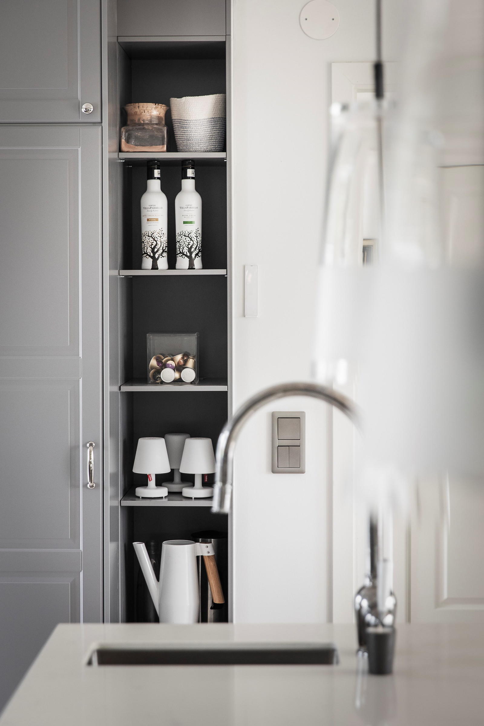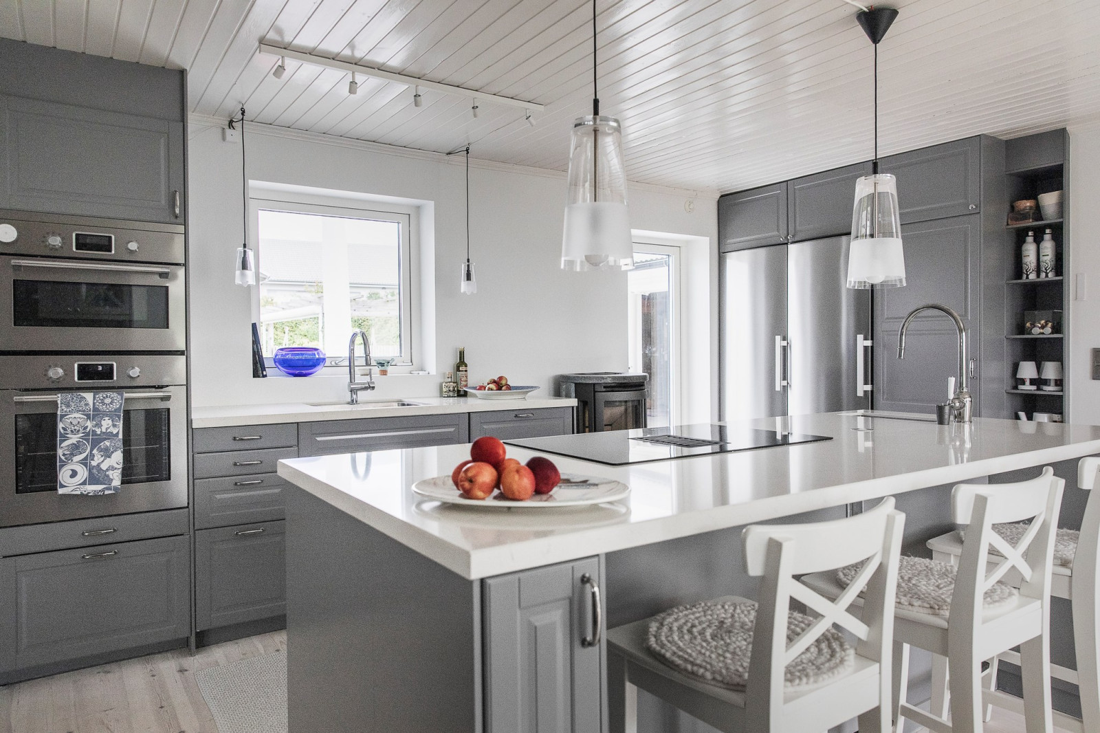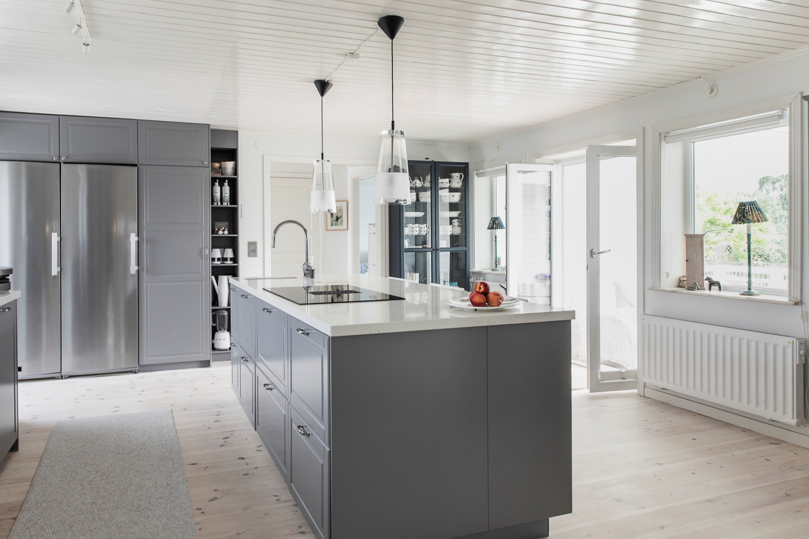 Modernt och stilrent kök med grå skåpsinredning (IKEA) och fin köksö med plats för barstolar – en naturlig samlingspunkt i hemmet. Köket är fullt utrustat med kyl, frys, diskmaskin, ugn, mikrovågsugn samt spishäll med inbyggd fläkt. Kamin (ej ansluten till skorsten, avsedd för biobränsle). Från köket nås både altanen/verandan på entrésidan och trädäcket i den insynsskyddade trädgården.