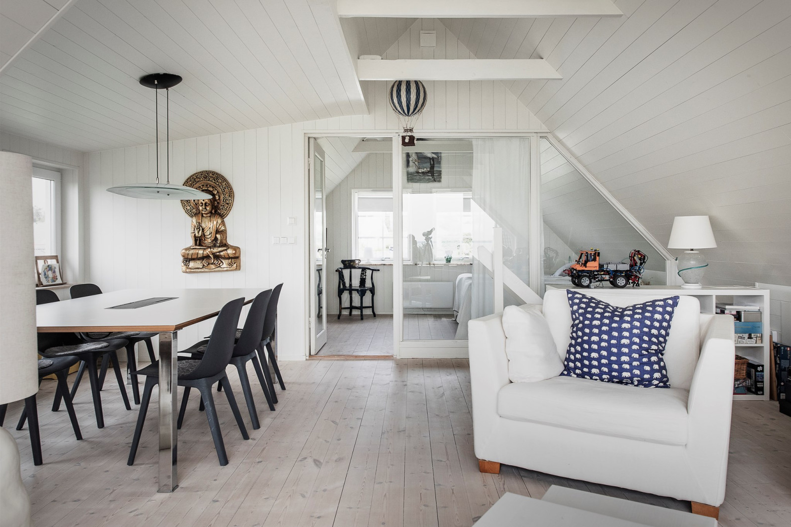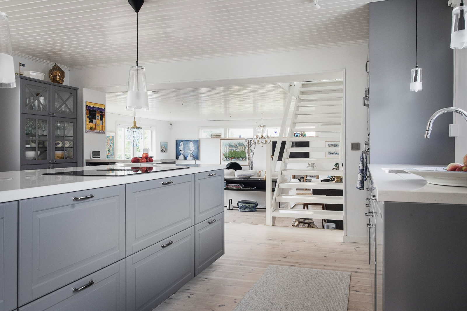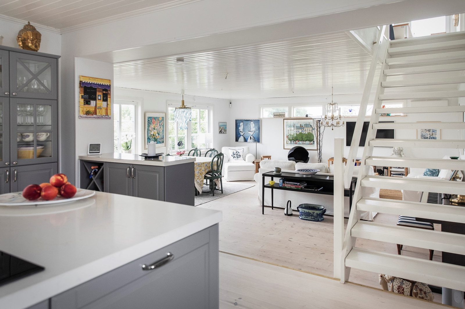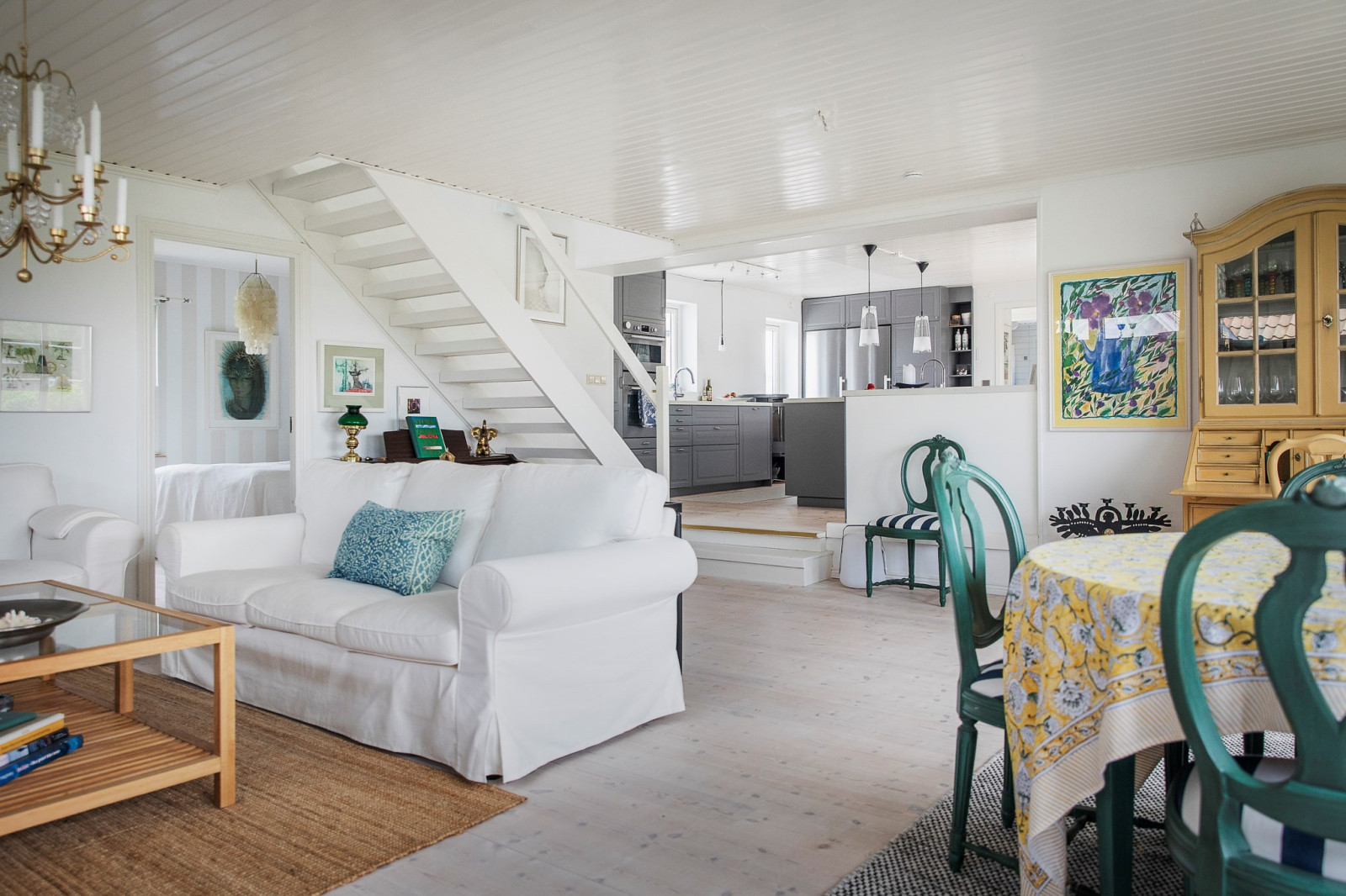 Genomgående vitlaserat trägolv bidrar till en ljus och enhetlig känsla i hela våningsplanet.
