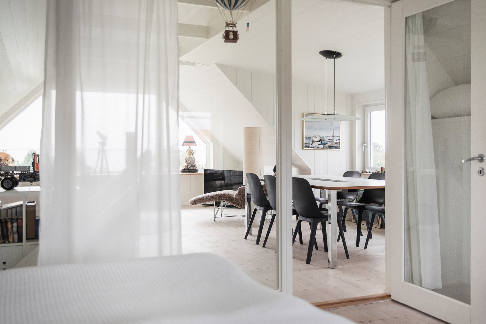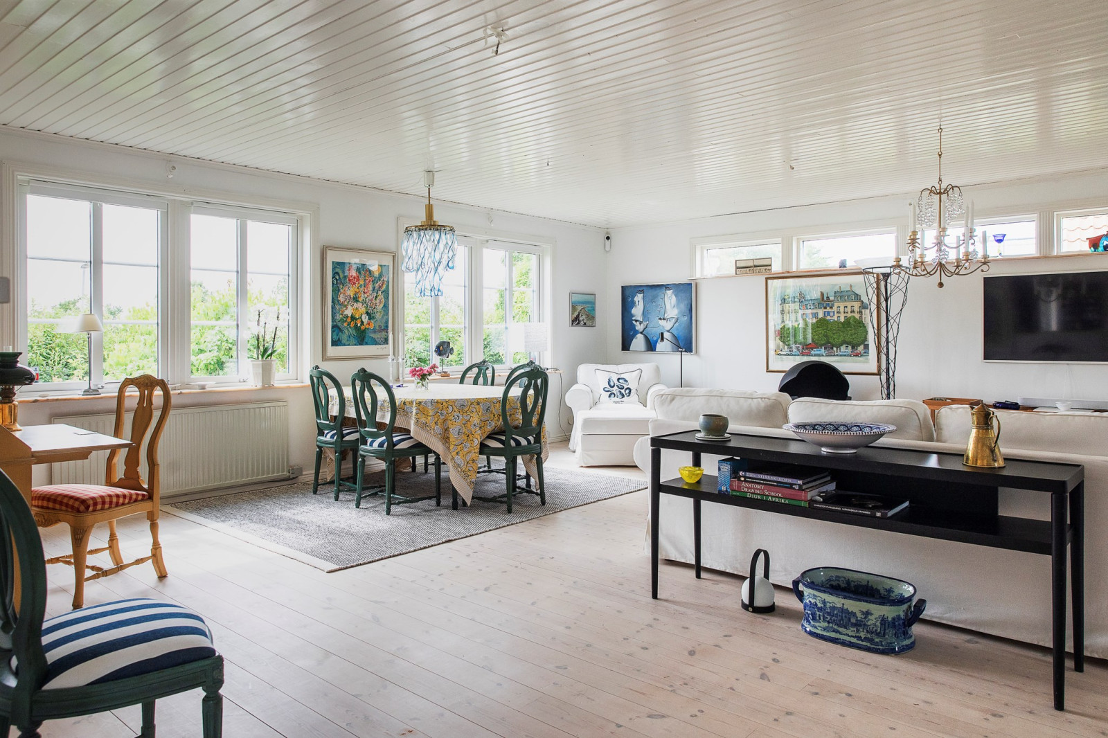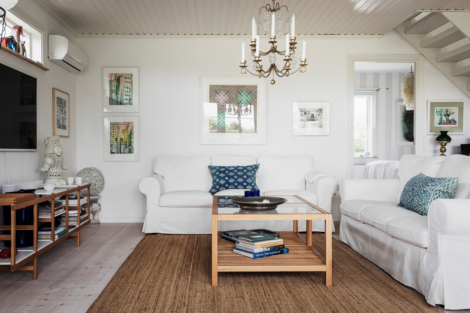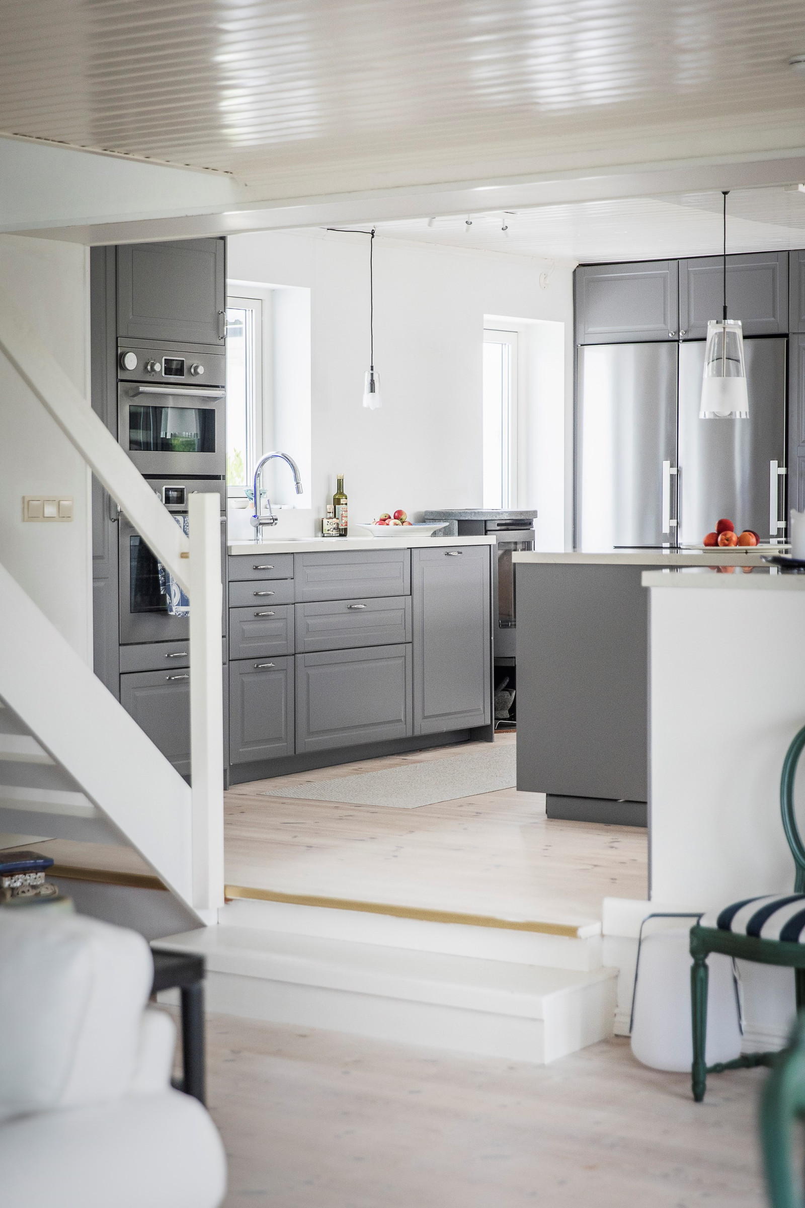 Genomgående vitlaserat trägolv bidrar till en ljus och enhetlig känsla i hela våningsplanet.