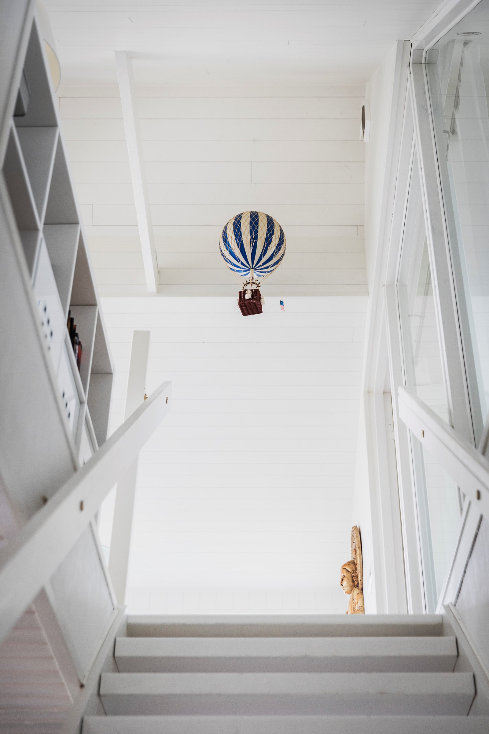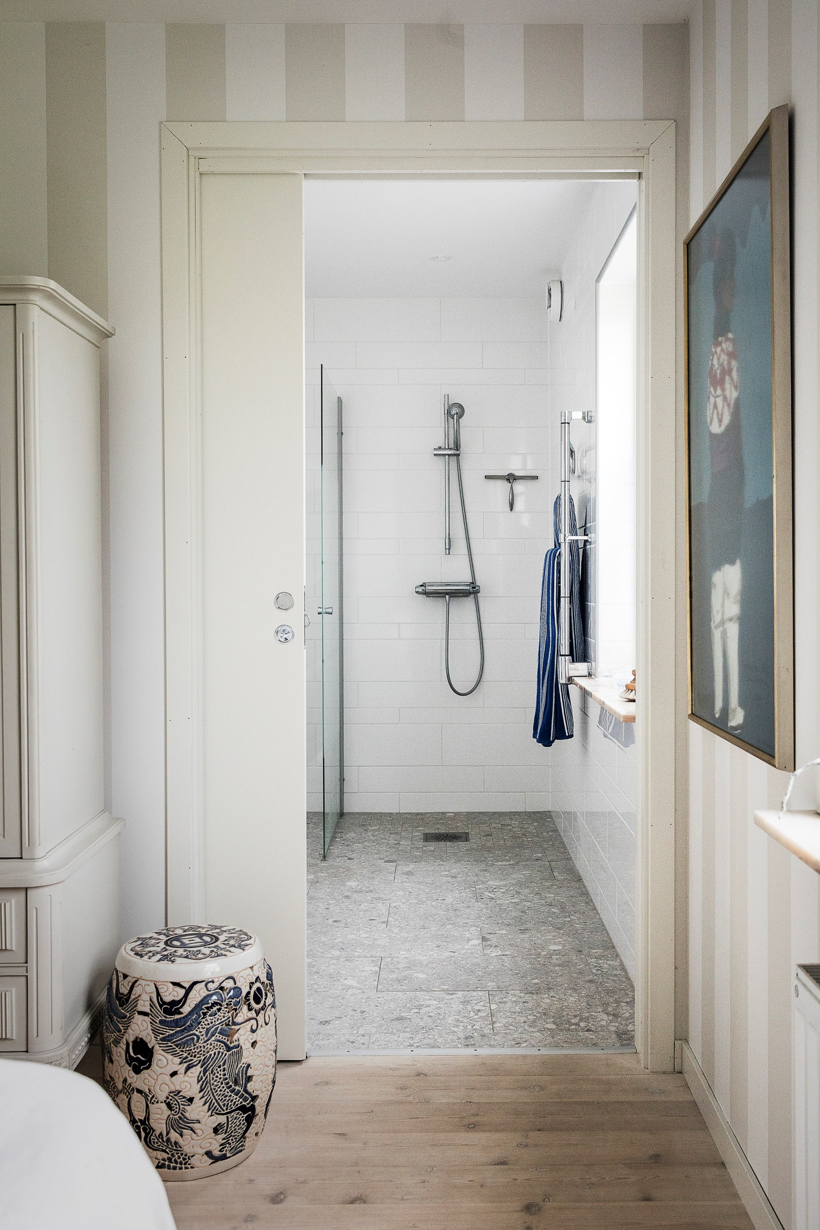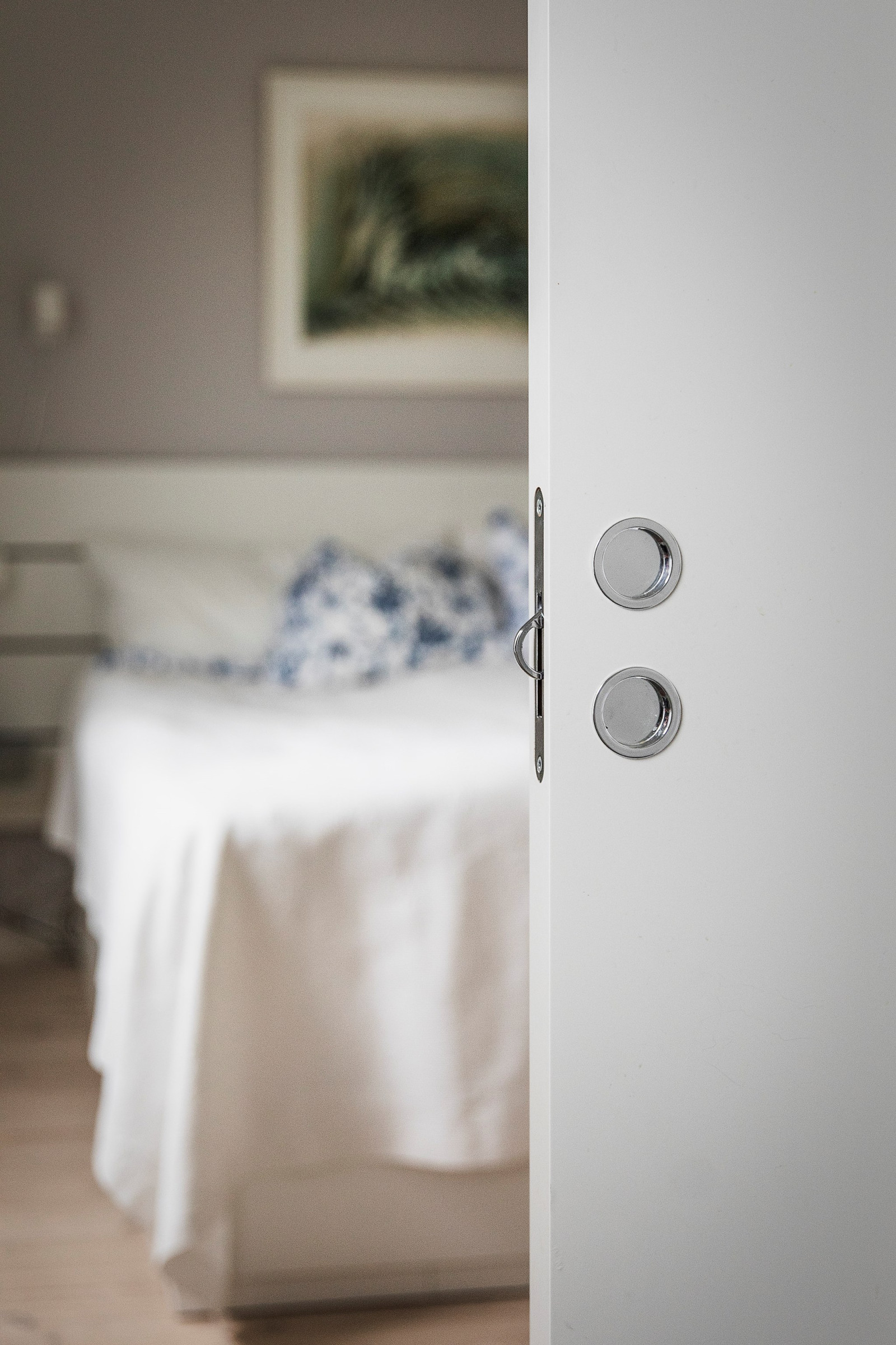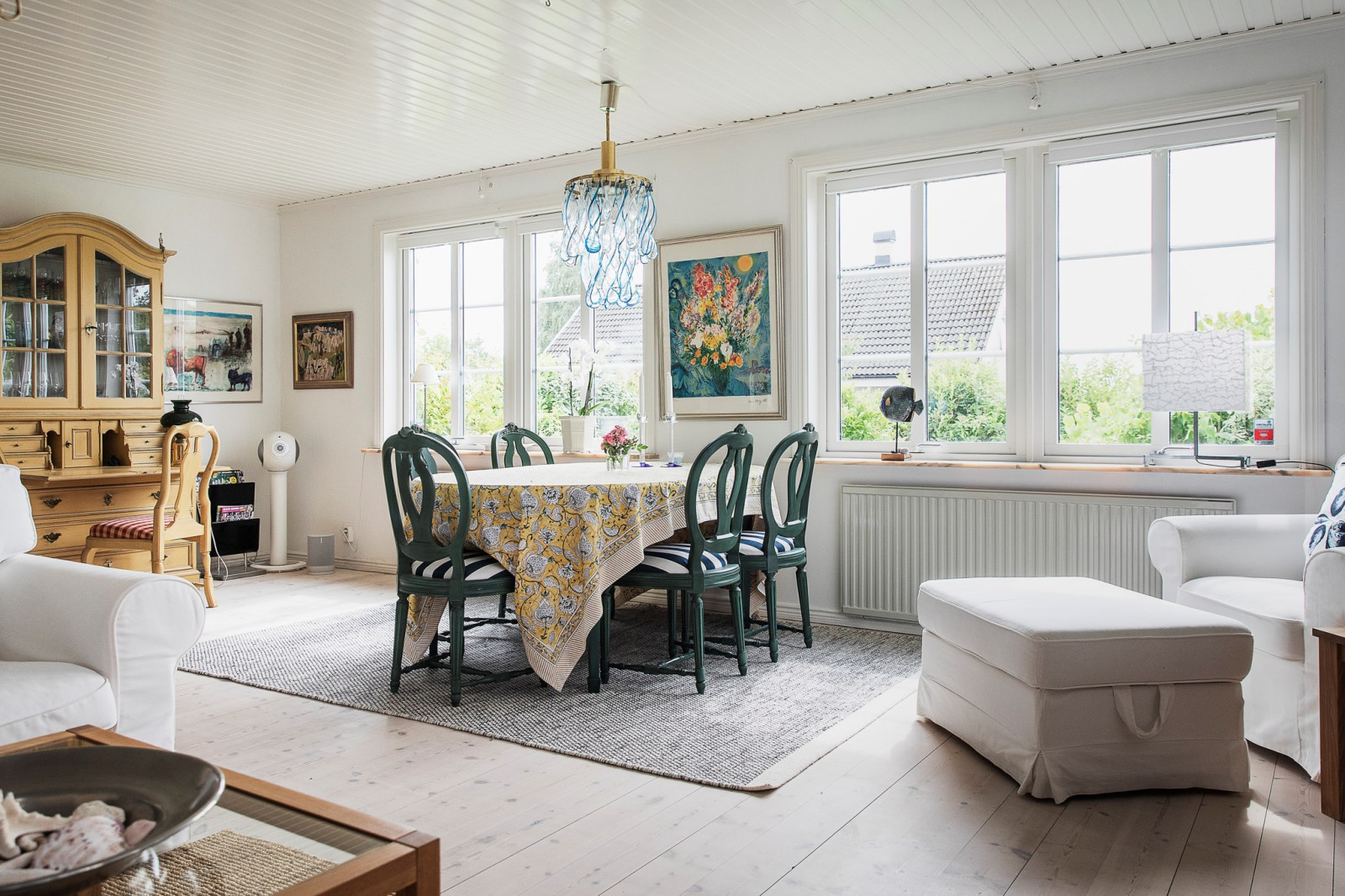 Genomgående vitlaserat trägolv bidrar till en ljus och enhetlig känsla i hela våningsplanet.
