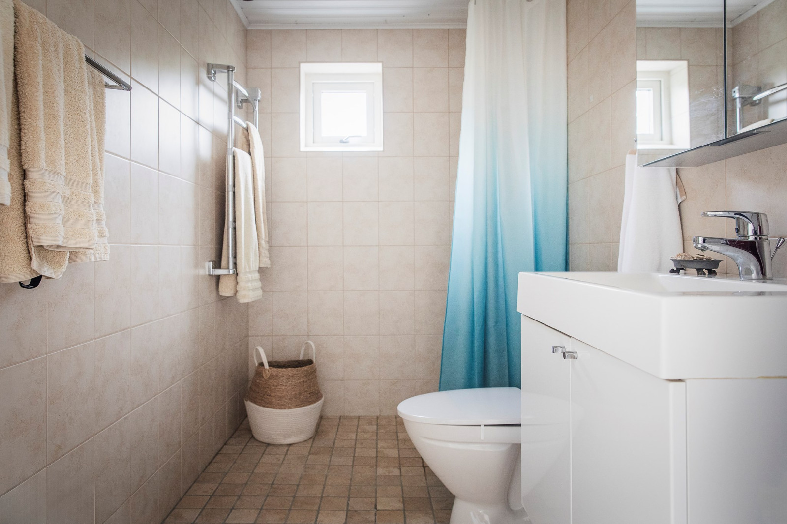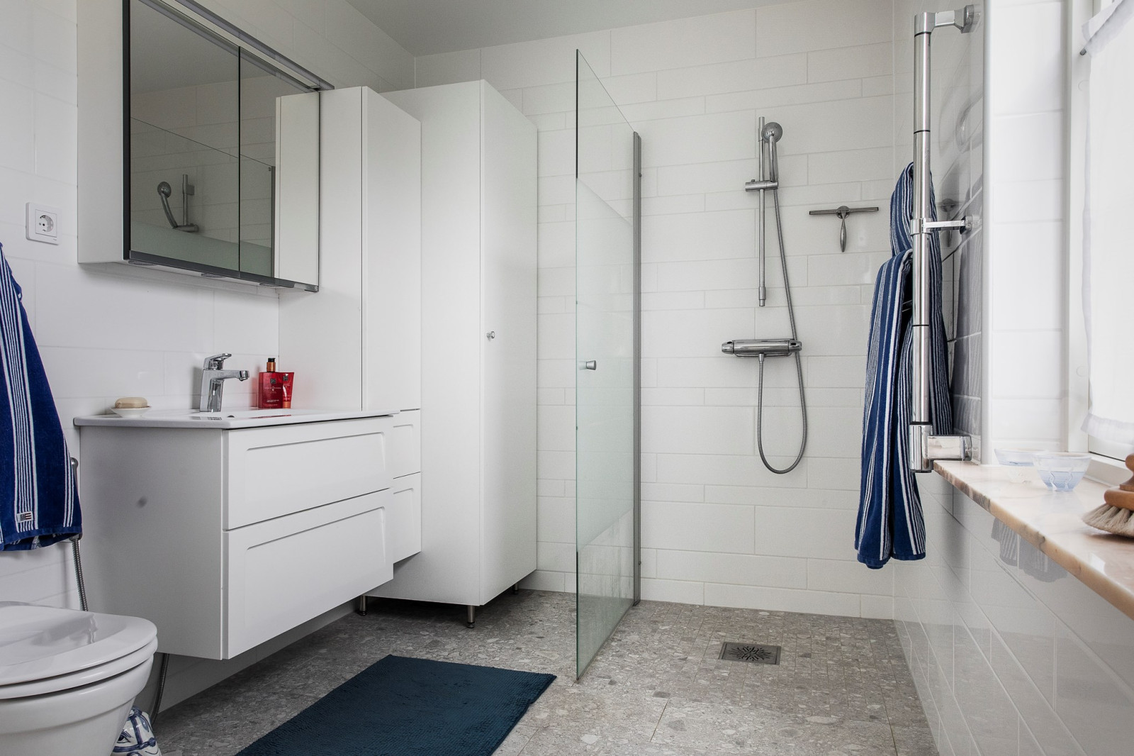 Entréhall med stilrent grått klinkergolv och gott om förvaring i garderober. Bostaden erbjuder tre helkaklade badrum, samtliga utrustade med dusch, wc och tvättställ. Tvättstuga med wc och dusch, tvättmaskin, torktumlare och varmvattenberedare. Sovrum med praktiska skjutdörrsgarderober.