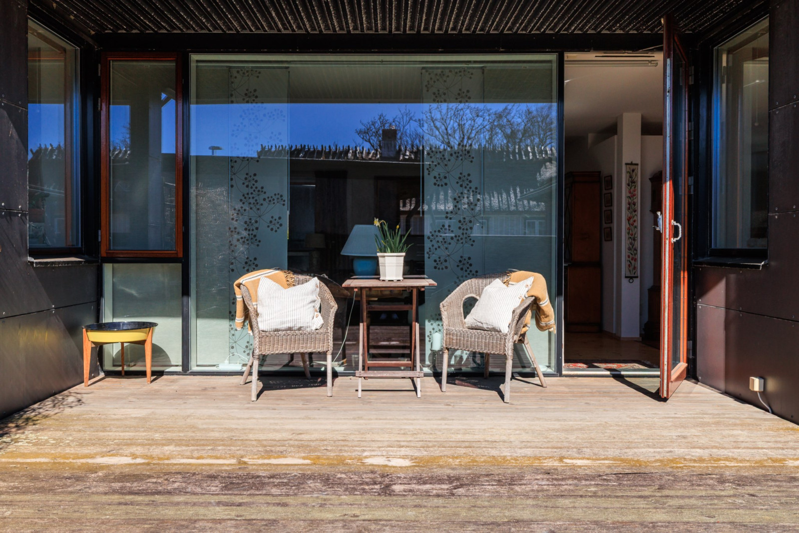 Beläget mot uteplatsen. Parkettgolv. Garderober. Utgång till uteplatsen.