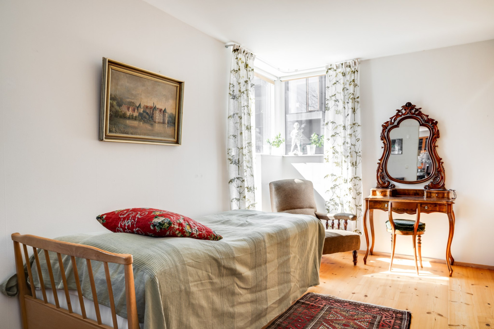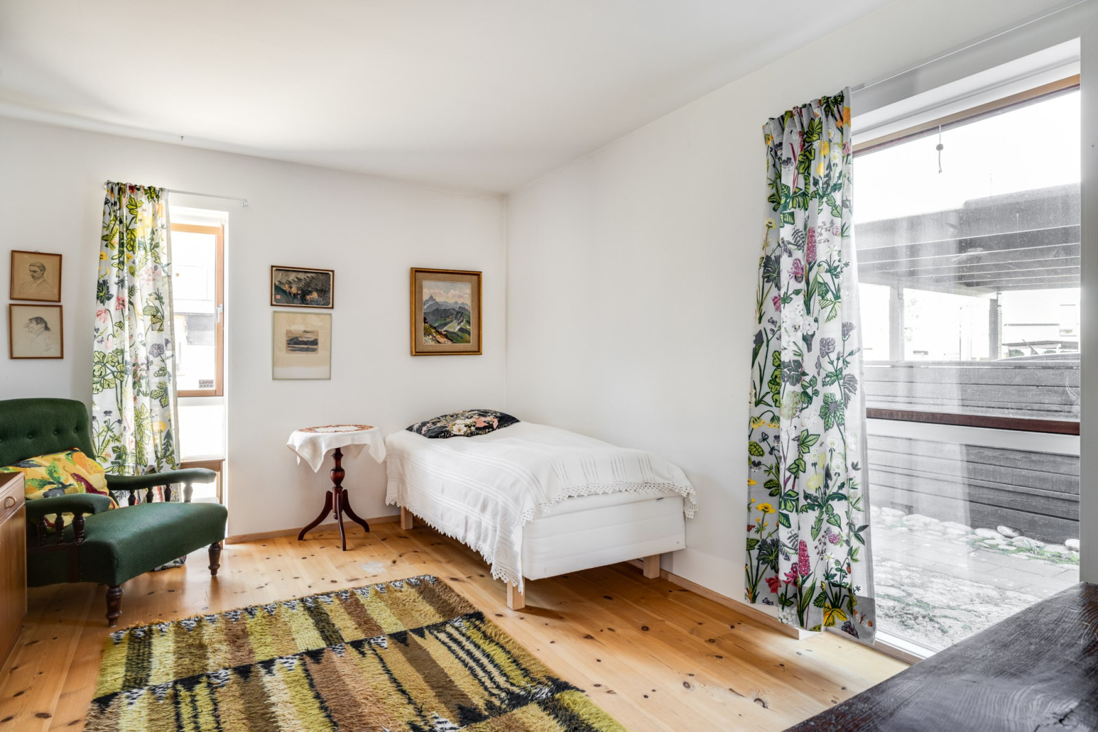 Fönster ut mot bostadens skuggiga baksida. Parkettgolv.