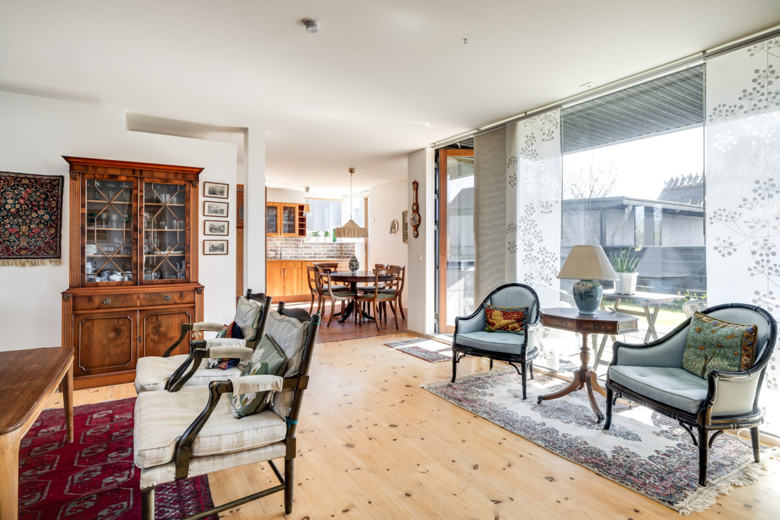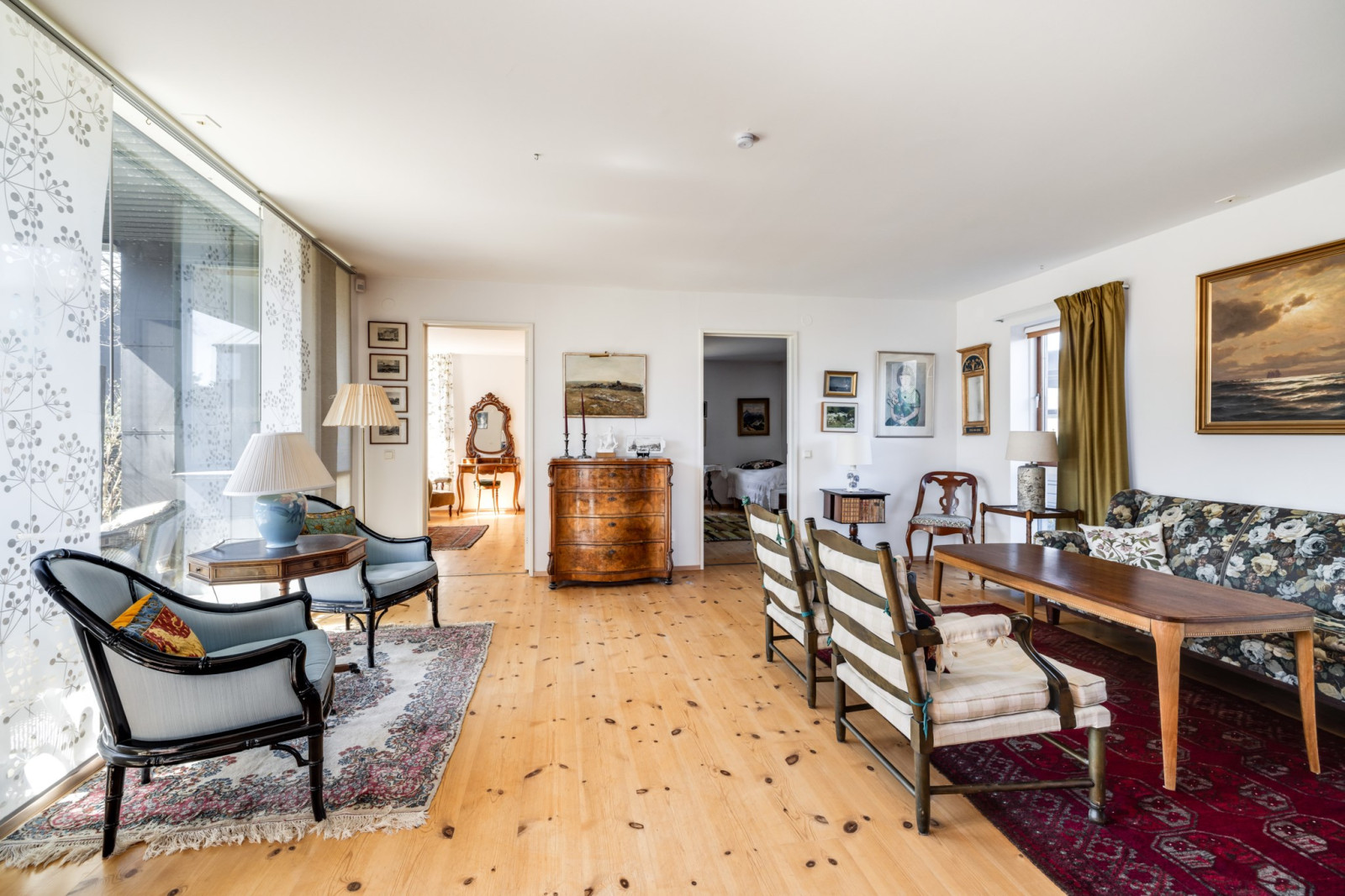 Rymligt och ljust rum med stora fönsterpartier ut mot uteplatsen. Parkettgolv. Altandörr ut till terrassen. Beläget mellan köket och de båda sovrummen.