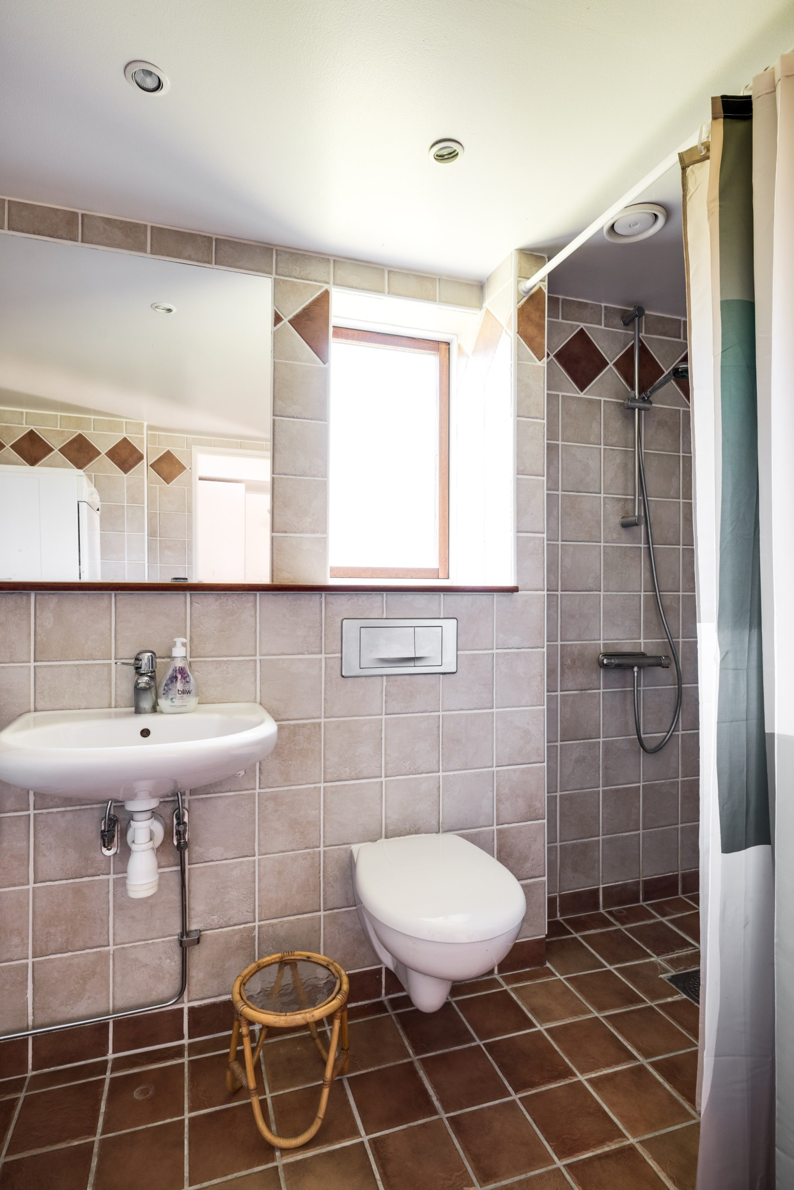 Helkaklat. Toalett, handfat och dusch. Utrustat med tvättmaskin och torktumlare.